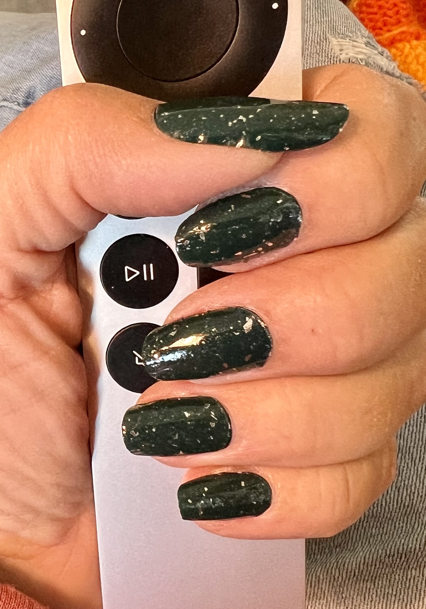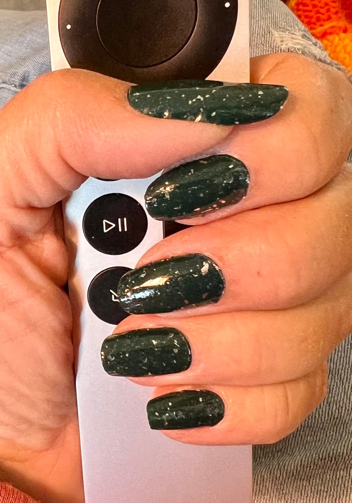 Ignoring the metaphorical elephant in the room (the room being my country) I’ll just share that I tried to paint my nails black, maybe with one nail with a little sparkle to symbolize hope. But when I put the set I’d picked out on, I realized it was actually dark green. There goes my mourning theme. I guess it’s now the dark embrace of the forest, with little ice crystals, which I put on all the nails.