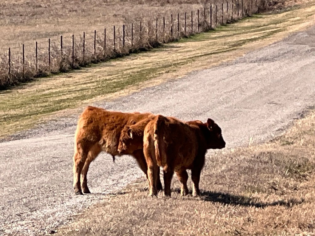 This was such a pretty day. It started out cool and barely got to 70°F. I had hoped to spend most of the day outdoors, and I got a good start in the morning by taking a long walk, then guarding two escaped calves until the owner could move them back inside. Only one truck was going fast enough to hurt them but I slowed it down. They’re valuable livestock!