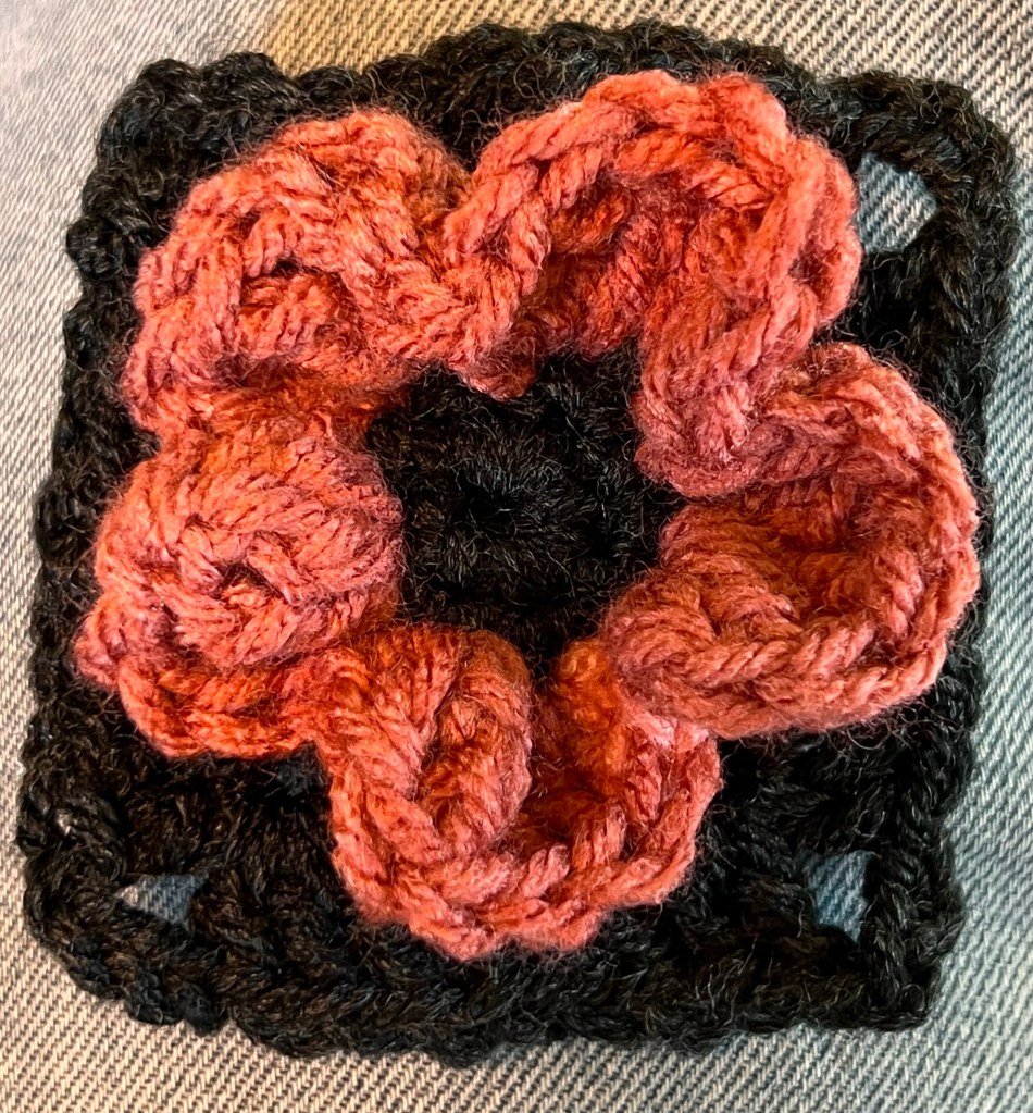 These are small, so I grouped them into four and made a larger square. I’m not sure if I like it or not. I may do a row of the flower color on the outside. Or I’ll try something else. Who knows. Maybe I’ll combine it with knitting.