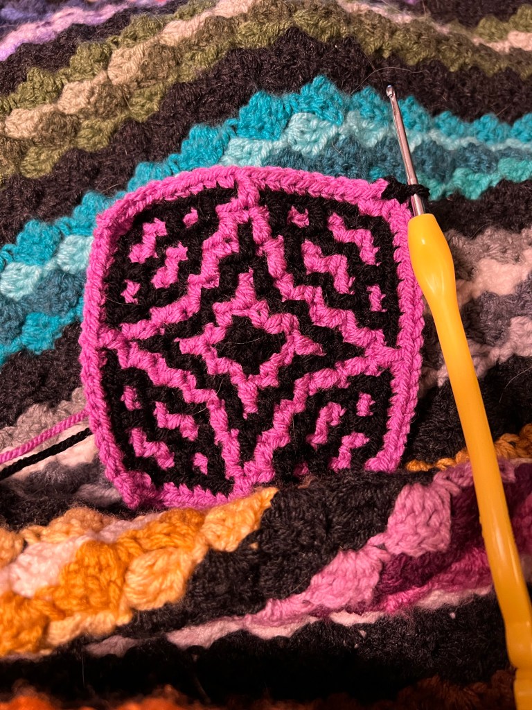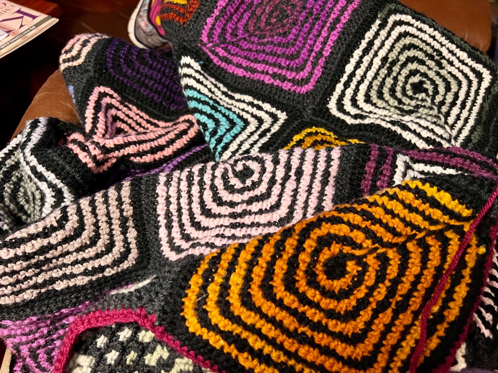 First, I love mosaic crochet, as long as it’s in the round. Doing it back and forth requires cutting the yarn on every row. Nope. That’s not gonna happen. I look forward to trying something else, maybe a little less chaotic, in the future. I always like techniques where you gradually build up a pattern, because wanting to see how it comes out keeps me going. That’s why I like fair isle knitting, mitered squares, entrelac, and lace.