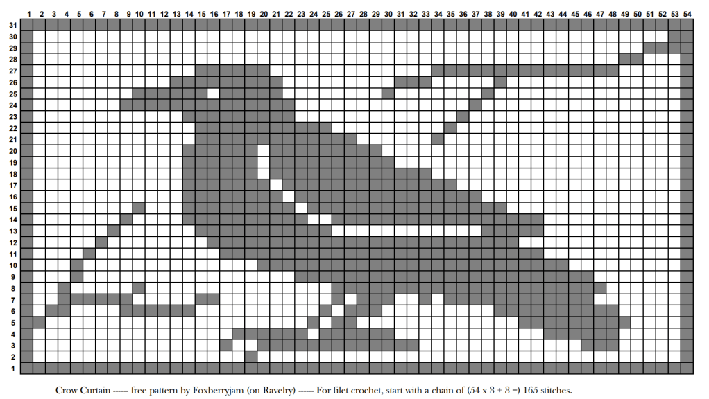 Yeah, right. There aren’t as many filet crochet patterns out there as I had hoped, and of course my ancient books full of patterns are still packed up. I also think I searched when I was sleepy. But that’s okay, I eventually found a free design of a crow, which fits rather well, since the Hermits’ Rest has a murder that I enjoy watching often.