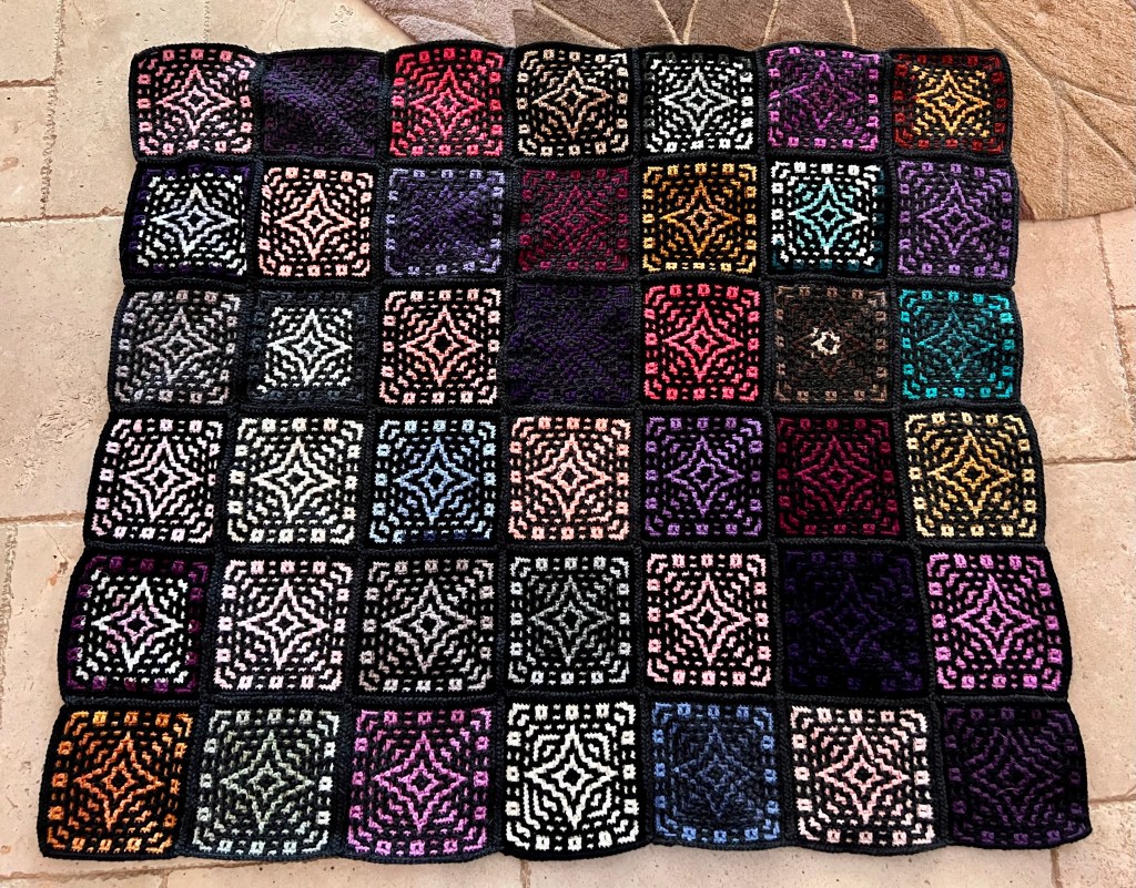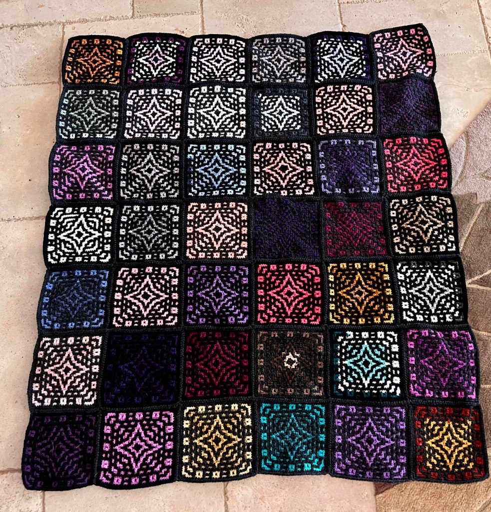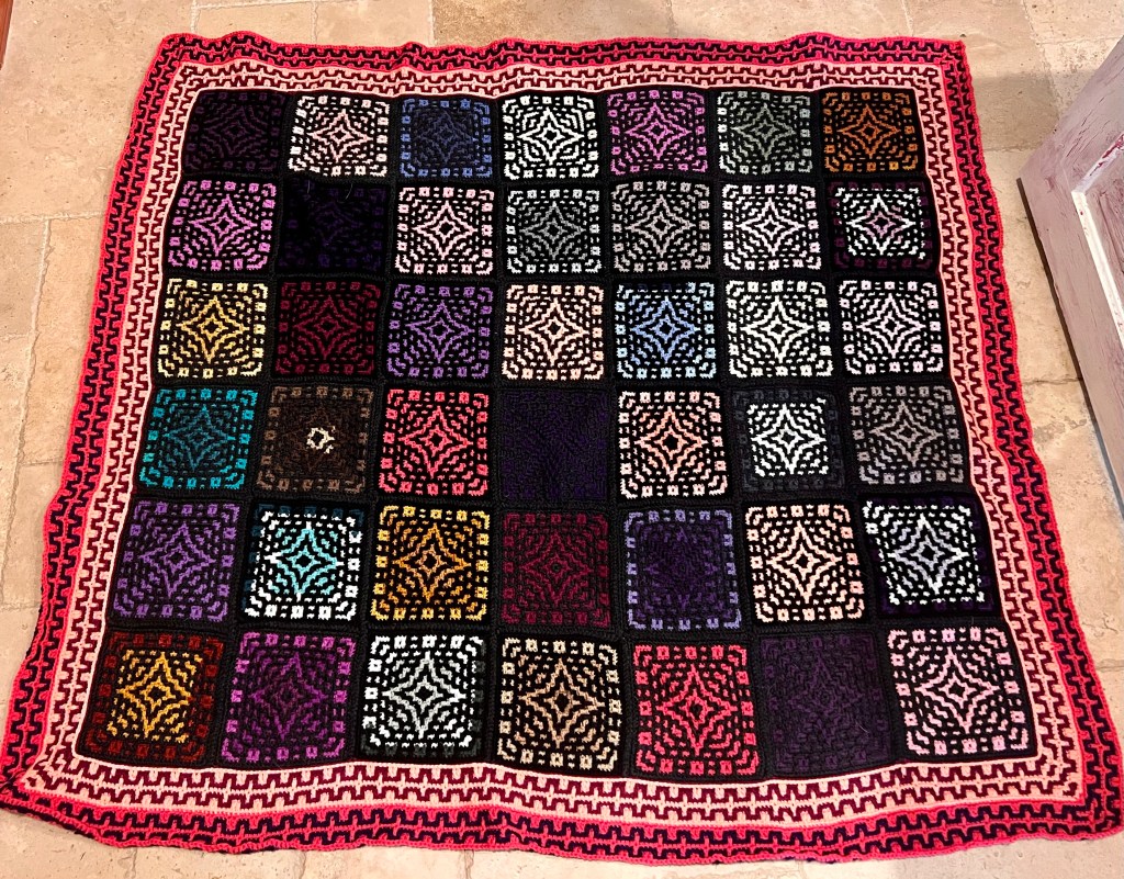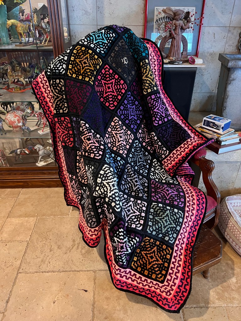 As you are probably aware, I’ve been on a crocheting kick for about six months or so. It’s nice to take a break sometimes, even though I’m still a knitter in my mind! I did finally finish the rug or afghan I’ve been working on and wanted to focus on what I learned from my first mosaic crochet project.