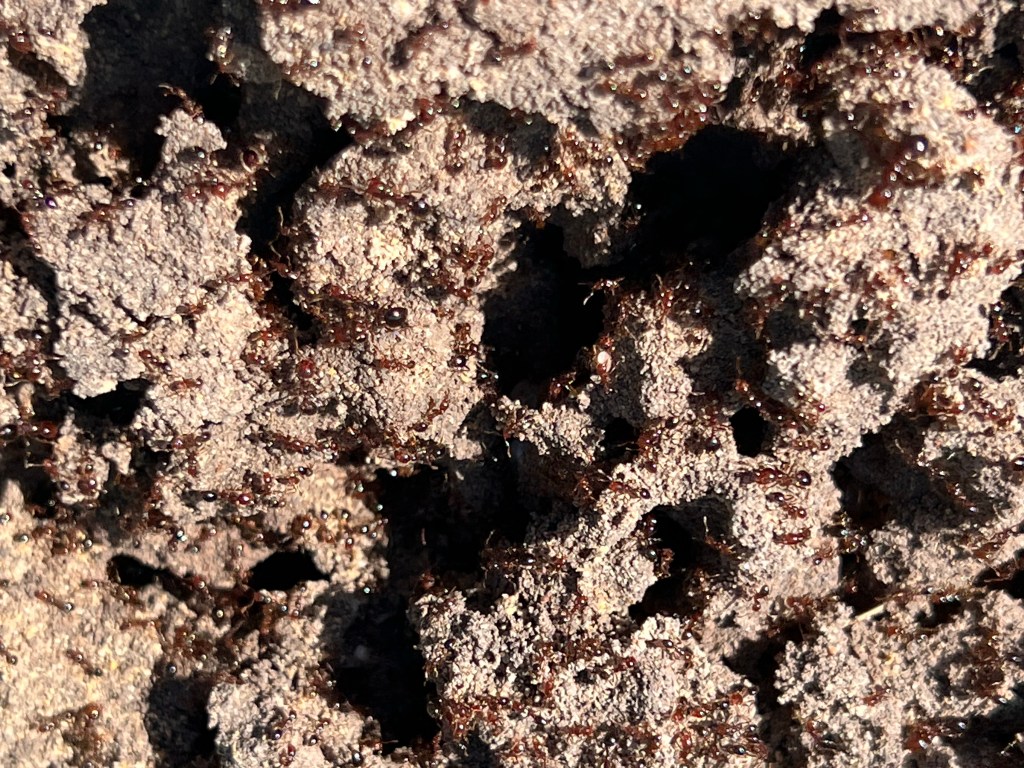 Almost done! Black finishing border next. Young pond slider checking to see if I’ve left yet. ExplorersSparrows inspecting my dressage markers. I bothered a huge fire ant colony by moving an upside down feed tub. What a beauty. Pollination process Flies are also pollinators. SunsetStart of the final edgeHe makes everything good.