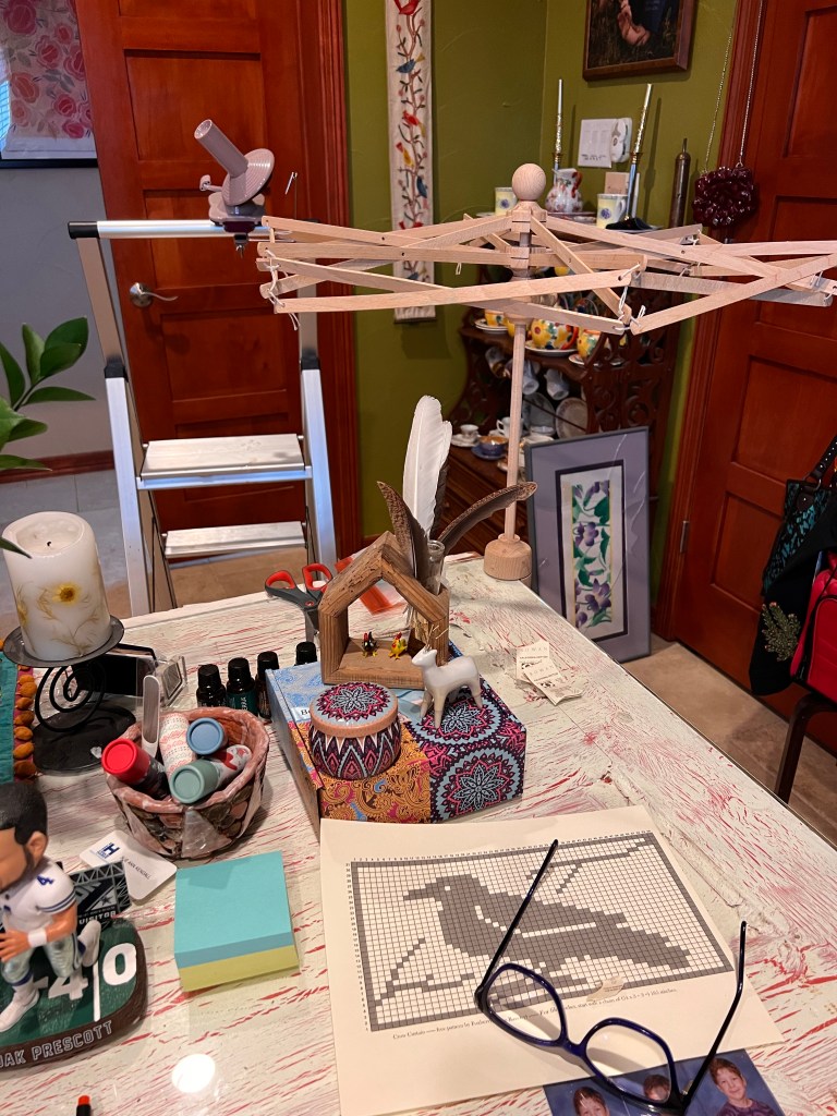 Well, I’m the only person who will care, since very few people go into the tack room other than me. Maybe it will be a tablecloth instead. It turns out the thing’s pretty big. Most filet crochet is done with crochet cotton, not DK weight yarn, you see. I have a feeling I’ll be trying something else to fulfill my filet crochet itch, a project that makes me appear more competent!