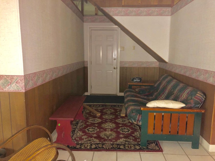 The lights don’t work in here, but maybe you can see the many chairs and tables I moved to make this arrangement. Not seen are boxes I moved OUT so it would look better.