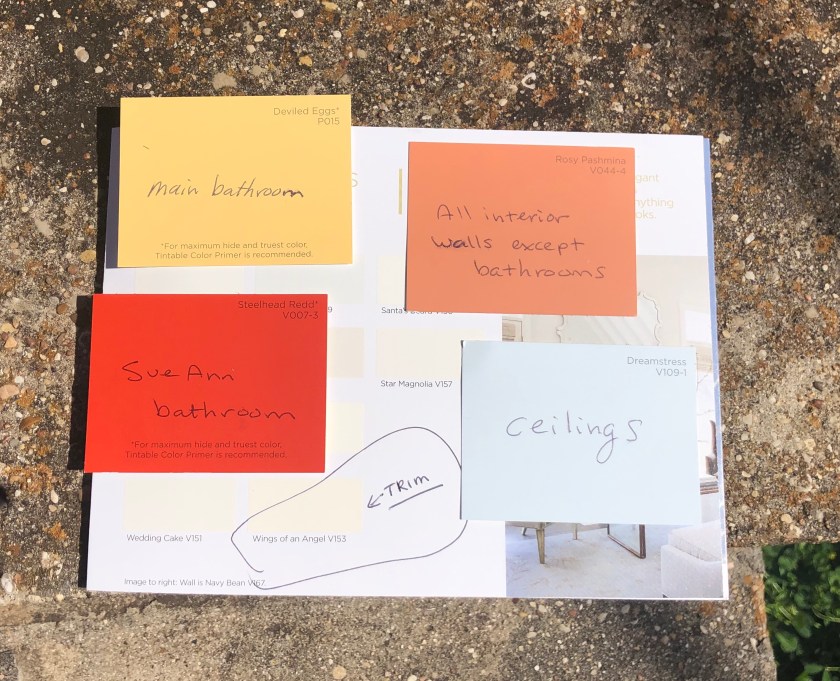 And in a move that I hope works out well, I selected a very pale blue (Dreamstress) for the ceilings that are currently white. I think they will register more as white, and will be a nice contrast to all the warm colors. I always wanted a ceiling that looked like the sky, and it reminds me of the tradition of painting porch ceilings the “haint blue” color.