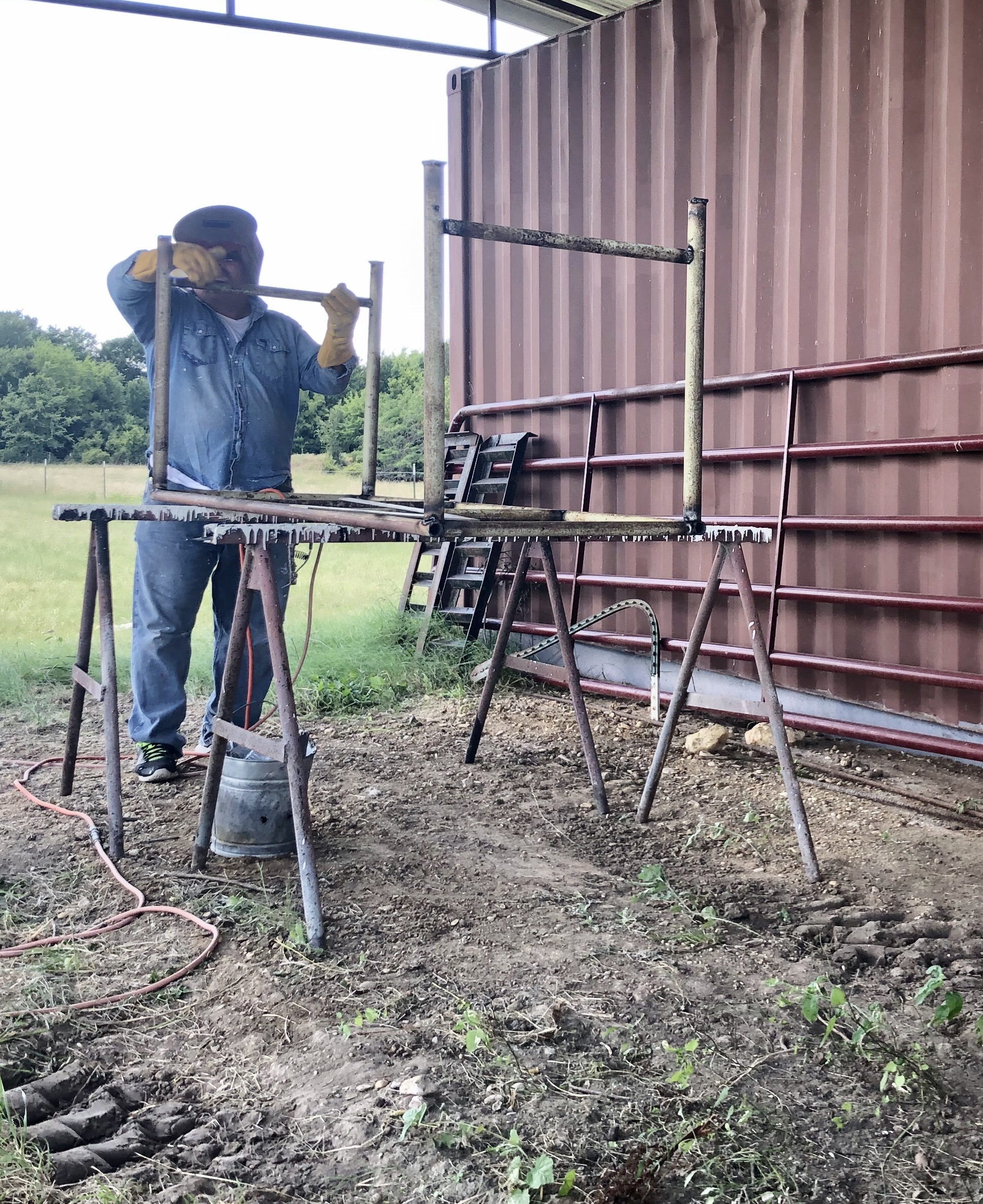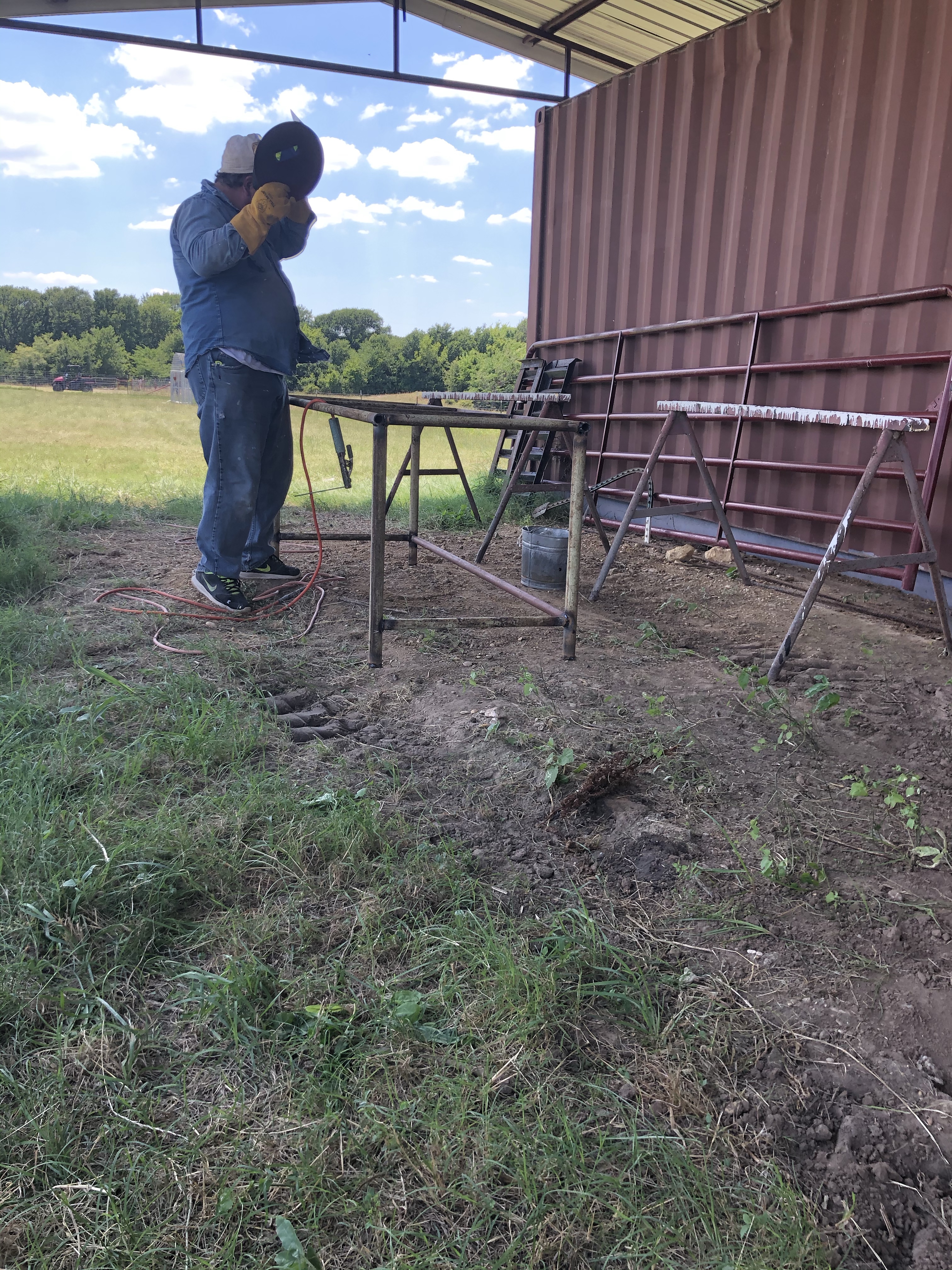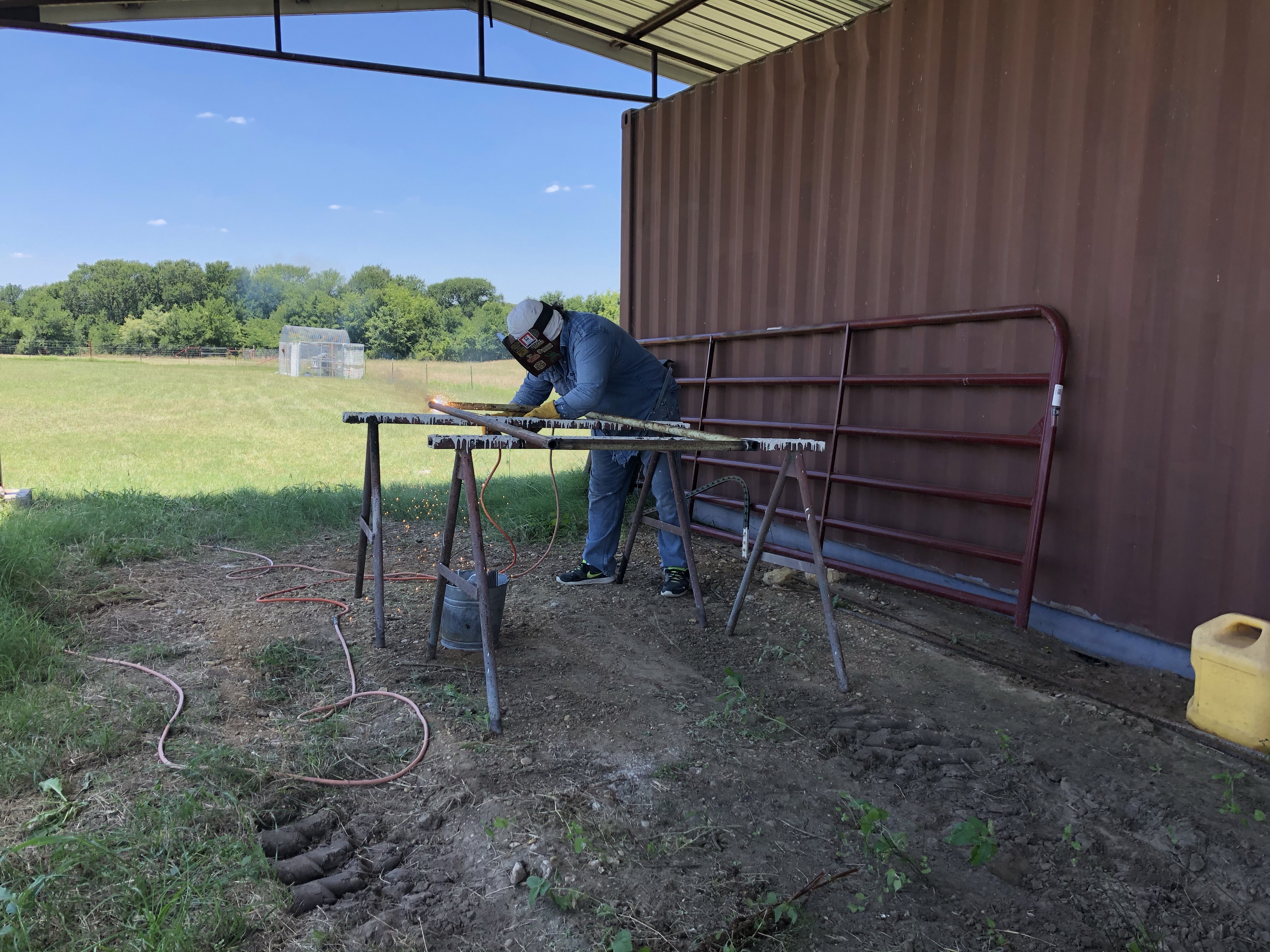 So, today was welding day. I’ve never watched anyone build with metal before, so I hung around and watched Chris as he worked. Numerous dogs helped until sparks started flying.