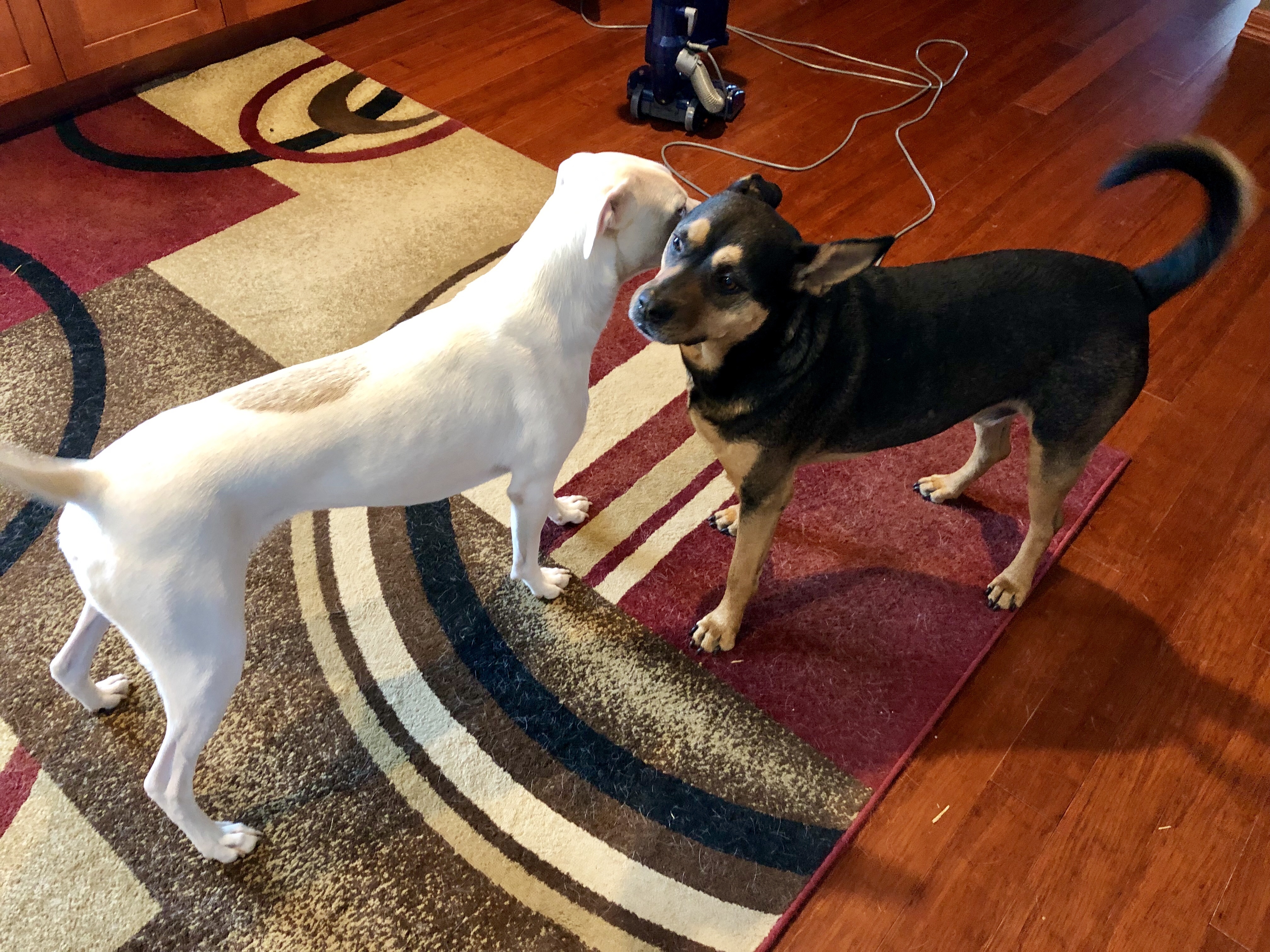 I think that’s getting better, though, because they have all been in my den on the couch playing away (I had intended to take a nap, but instead I took pictures of the smaller dogs all playing together indoors).