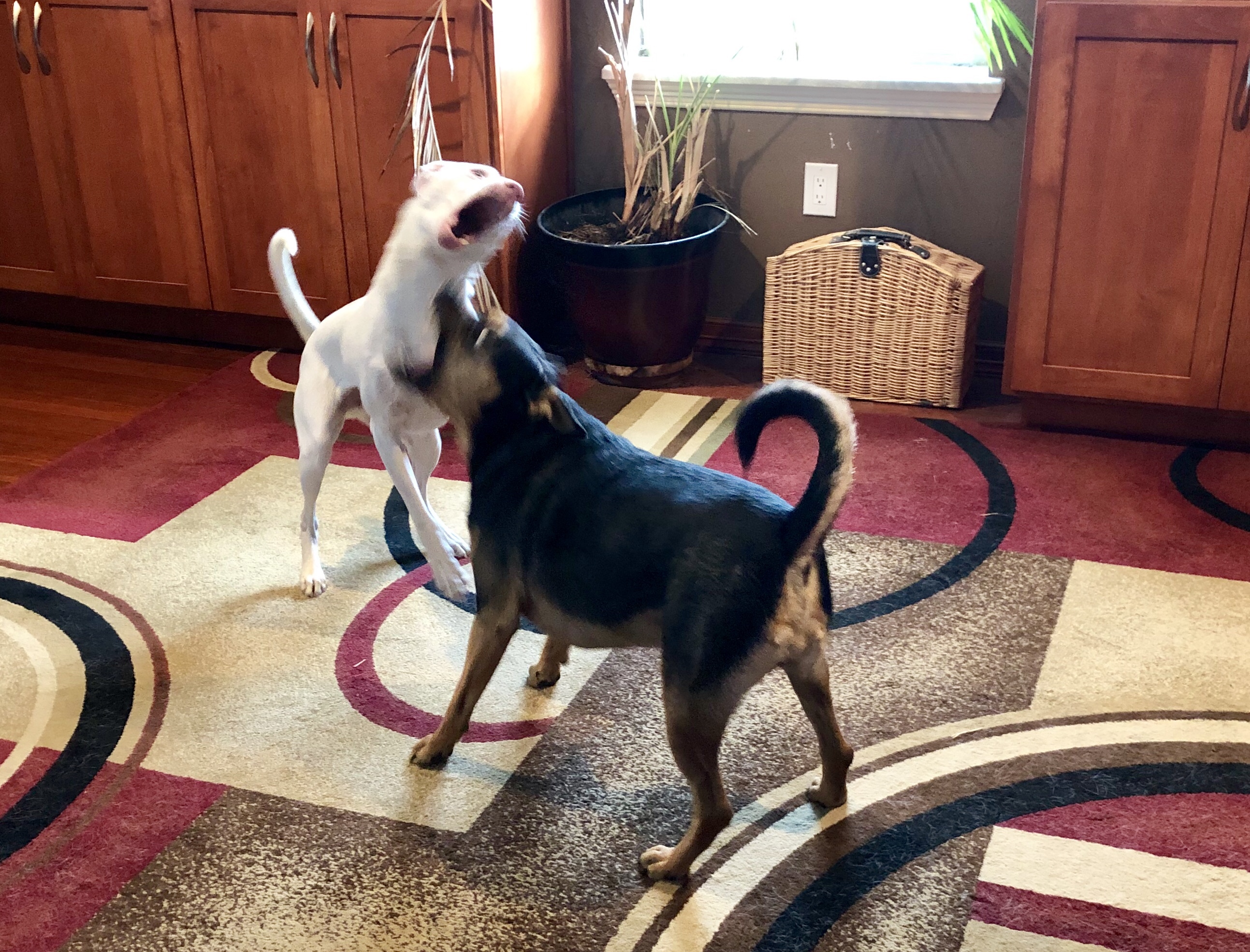He loves his canine friends a lot, too, though he has to occasionally remind them he’s small. His little jaw snaps repeatedly when he’s wrestling with Carlton or Harvey. And when Penney joins in, it’s glorious. We humans just have to smile.