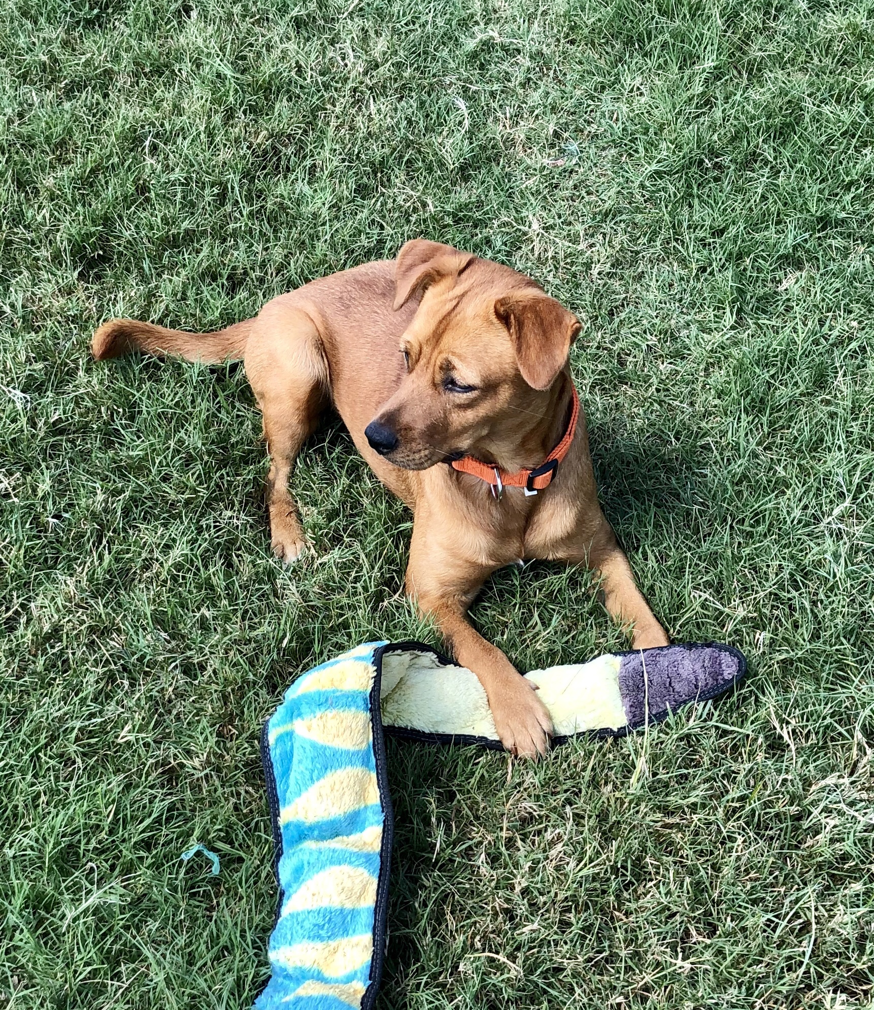 He seems a lot calmer now, and less prone to his growling habit. He only gets testy when Carlton gets too relentless in his play requests. He also enjoys running and playing with Vlassic, which provides us with hours of fun.