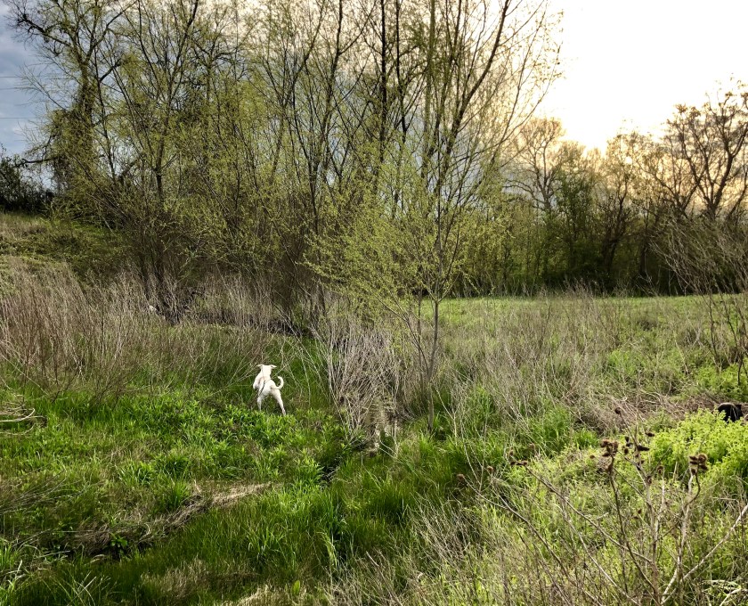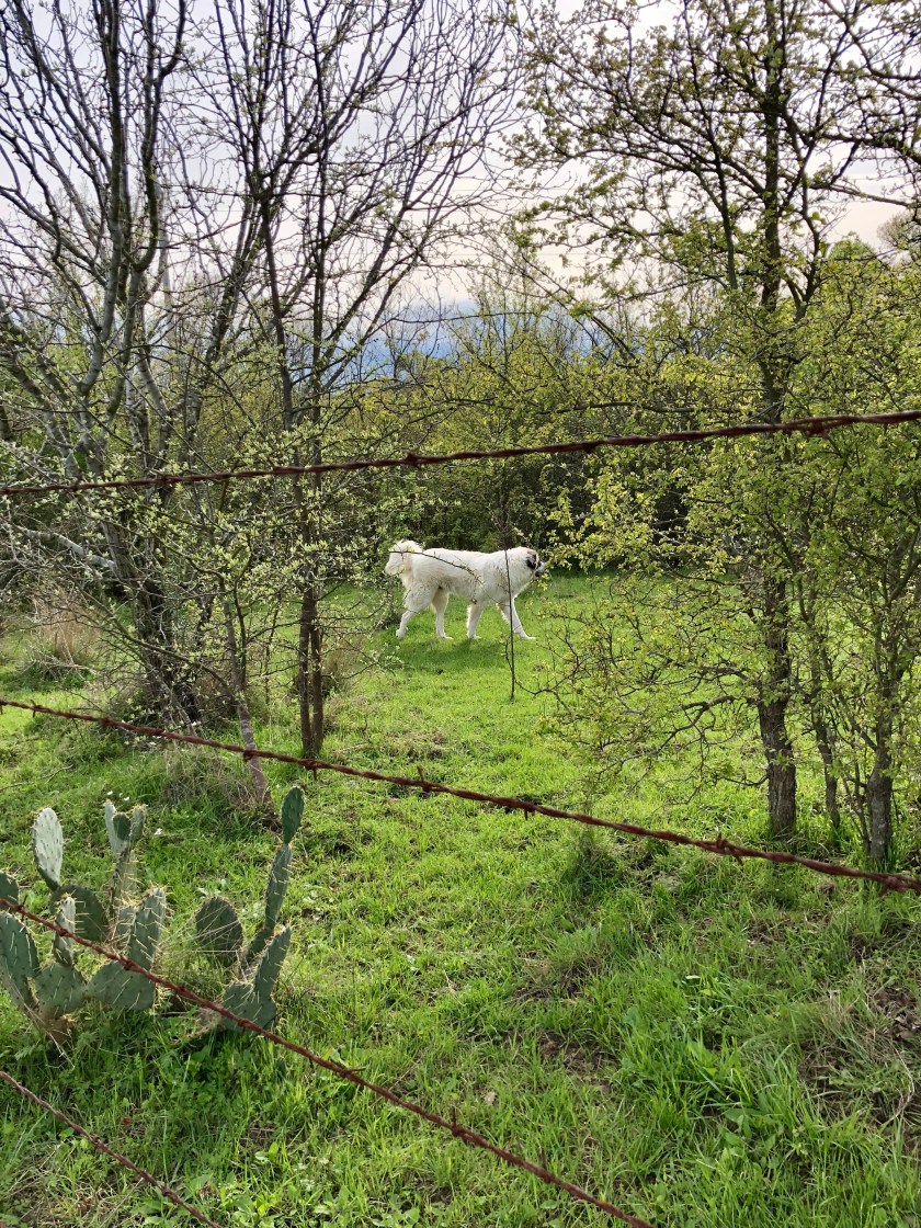 Usually, the animals are way over by the creek, or on the far end of the big pasture. But today, they decided to torture our dogs by grazing on both sides of our fenced-in back yard.
