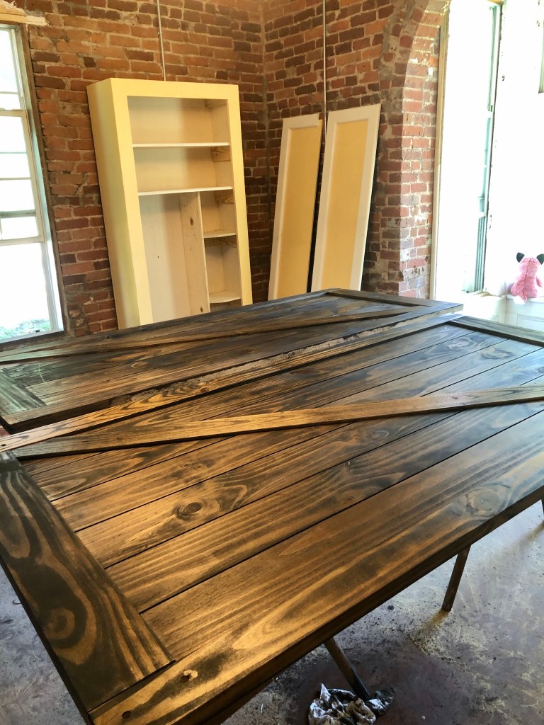 He already stained both the barn doors, one of which goes in my office bathroom and the other that goes between Lee’s and Kathleen’s offices. That’s the same color the stairs will be, too. Sanding is coming soon!