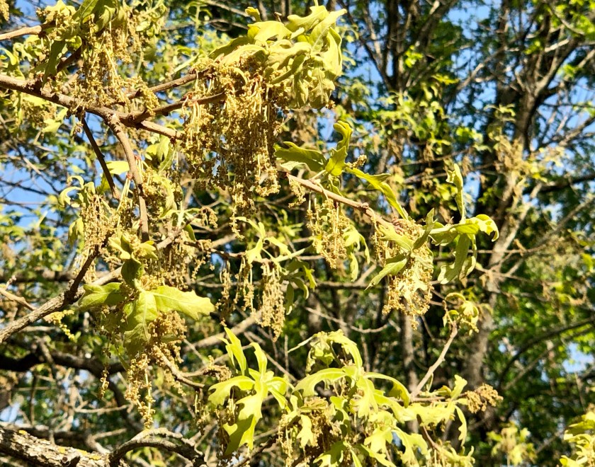 Right now, they are in their blooming stage, so I got to see a lot of oak catkins, which Doug Tallamy told us in the book are the male parts with all the pollen on them. They do look pretty, even if they make many folks all clogged up with sinus stuff and turn our cars yellow.