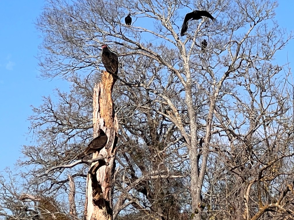 I also saw lots and lots of chickadees and cardinals. Of the sparrows I saw, I could ID a chipping sparrow and a white-crowned sparrow. There were also phoebes, a yellow warbler, and some very entertaining vultures, both turkey vultures and black vultures. I enjoyed watching them flying, roosting, and preening.