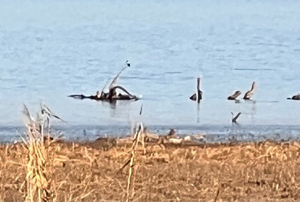 But whoa, I did NOT expect the next thing I saw. I was looking at a pretty group of ring-neck gulls through my binoculars when I realized one of those gulls was awfully big. It was a beautiful white pelican! I watched it swimming around and diving for fish for a long time. Then, as I was sitting outside doing a call, I saw a bunch of big, white birds. The pelican had friends. They were a LONG way away, so forgive the blurriness of the photos.