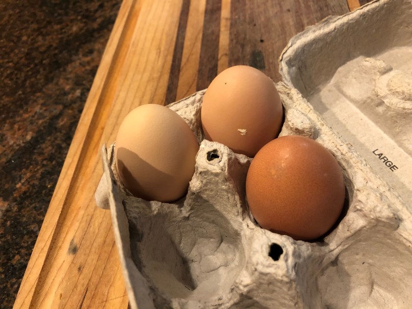 The front egg is the one we found in the garage. The other two were in the henhouse, courtesy of Star and Springsteen.