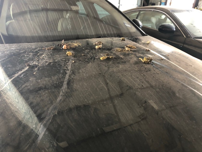 Yuck. Soon as the dang tire is back on the car, I’m moving it, cleaning it, and putting a tarp on it. Geez, that’s gross.