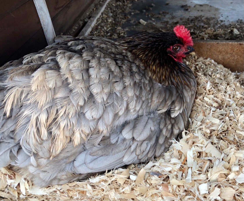 I read that eggs take 21 days to hatch, so today may be the day Star’s three eggs hatch. I haven’t “candled” them (no tools) to see if there’s a developing baby in there, so I have no idea if any of the eggs are actually viable. If they all hatch, we will have mothers who produce white, tan, and brown eggs, all fathered by Bruce, who carries the gene for blue eggs.