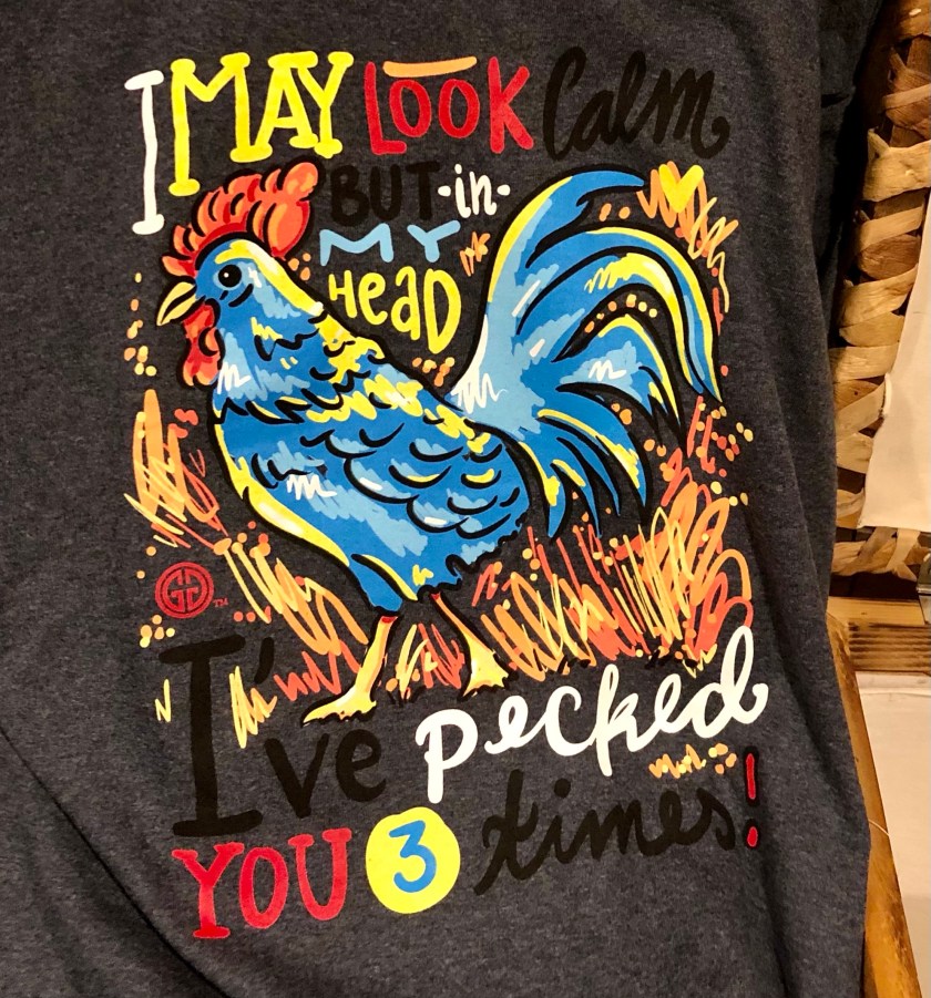 My shirt from yesterday said, “I may look calm, but in my head, I’ve pecked you 3 times!’ and has a blue hen on it.