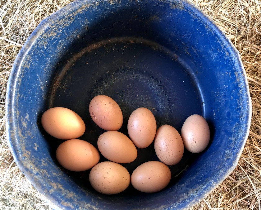 Then I went to find Bertie Lee’s eggs. But there were NONE where I found the last bunch. So I looked under everything. Voila! There were 7 eggs, one broken, in the original corner where she first started hiding her eggs, on an old mop. Let’s hope she keeps this location up.