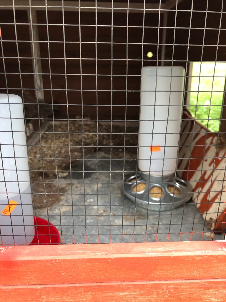 Yesterday I brilliantly realized I hadn’t gotten chick feed. Oops. I got the medicated kind, because I can’t give a chicken a shot, even though I got a demo once. While I was at the local farm store/boutique/dry cleaners, I got a small feeder and waterer that will fit in the nest box area.