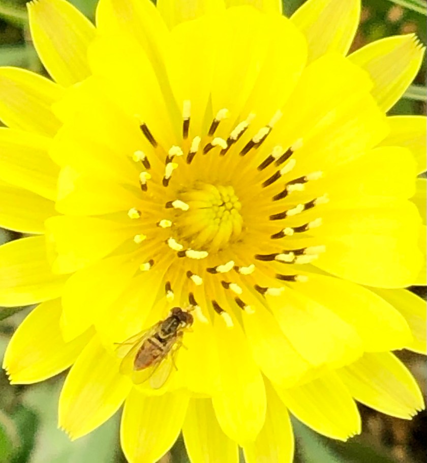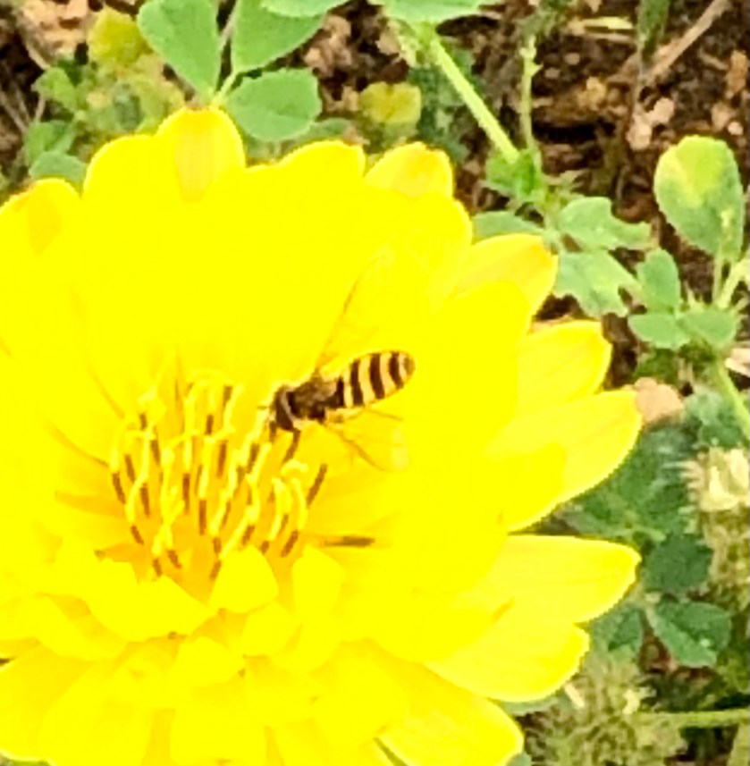 The distraction today was how many different pollinators were buzzing around the false dandelions over by the chicken run. I saw at least four different kinds, ranging from tiny hoverflies to a long-horned bee about the size of a honeybee.