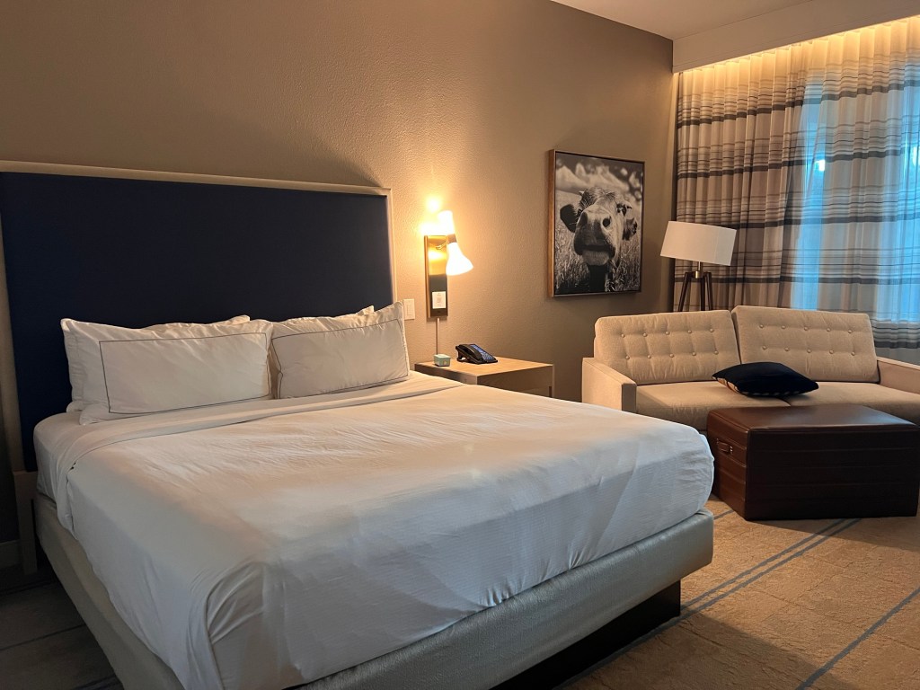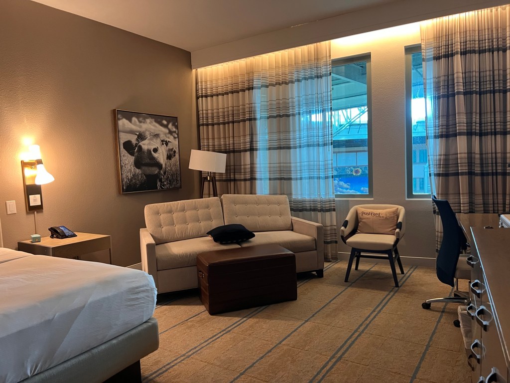 I know Lee loves me, because he drove me to the Austin airport today and dealt with the dreaded “Austin traffic.” But we got a cool upgraded room with a couch in it, so he’s happy (he sleeps better in couches or recliners than beds). The Hilton at the airport used to be the HQ building at Bergstrom Air Force Base, and is circular. I always enjoy staying here.