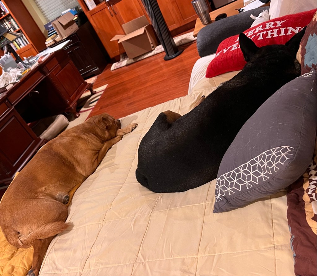So I got up and moved the immense and very heavy television. It’s the old one from our house in Round Rock, and apparently giant televisions were much heavier then. Glodie is much happier now and I can type (she kept nosing the keyboard away!).