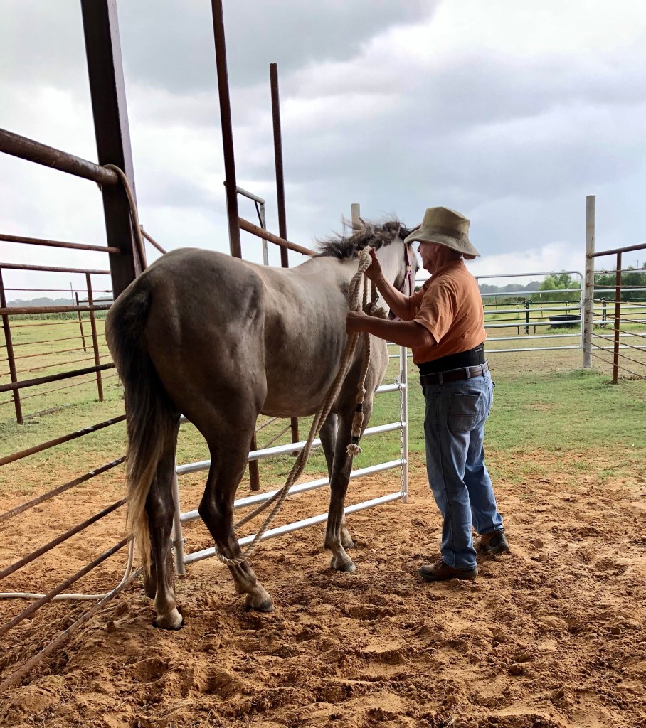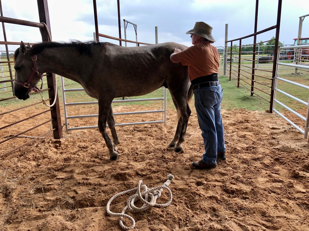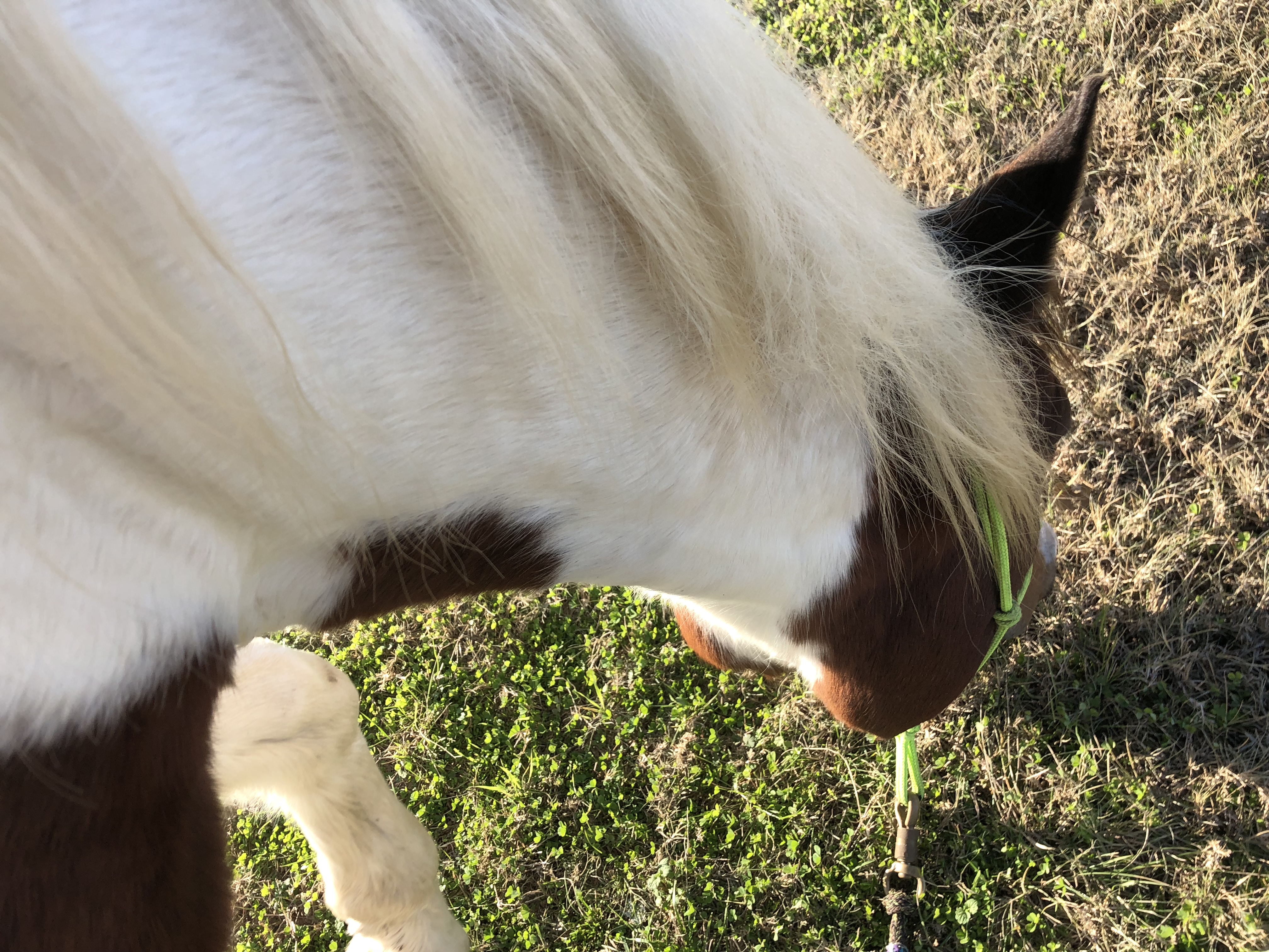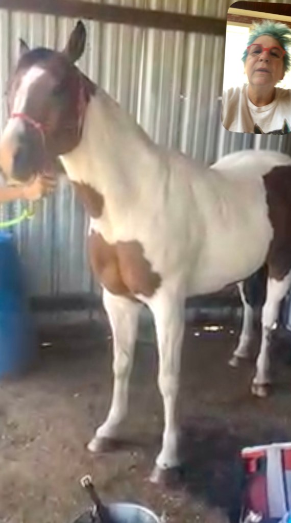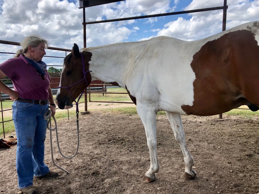 Her theory is that he could have scar tissue or adhesions from being gelded in a popular way I’ll not describe here. That makes sense to me. So, she worked on him. He loved neck stretching but not foot work, which didn’t surprise me.