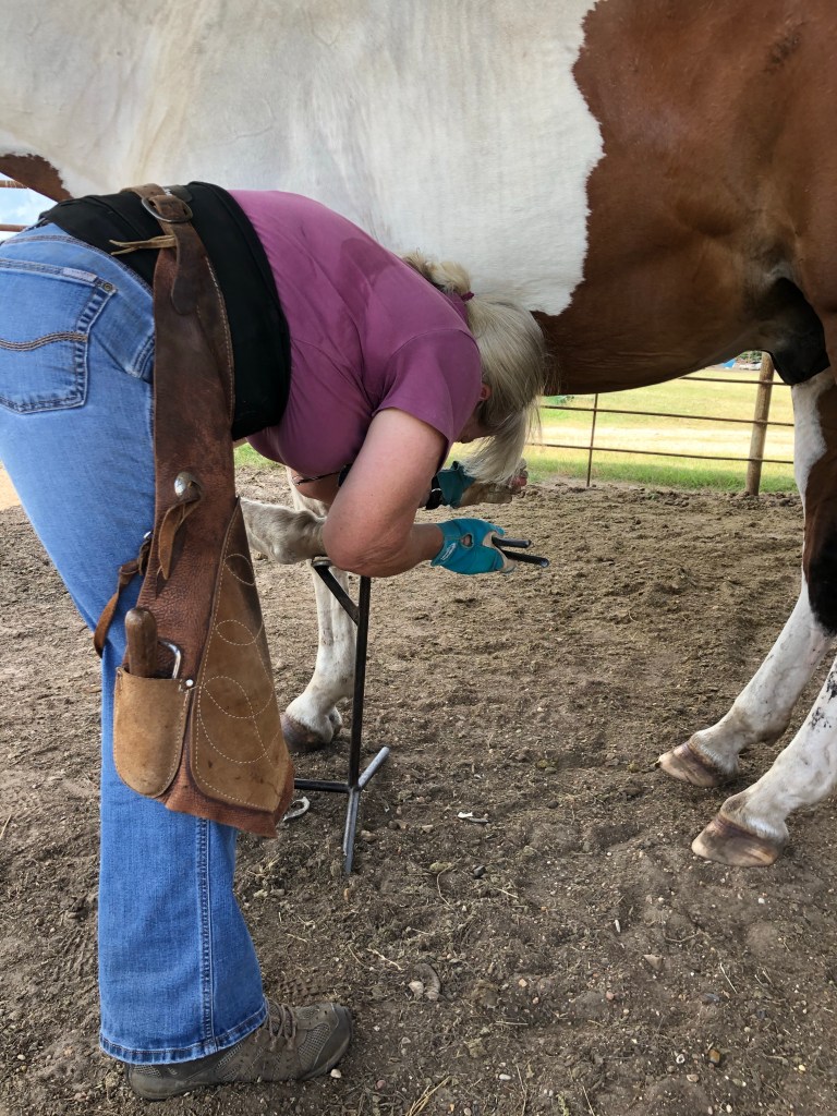 Then, by mid-afternoon we were back at the ranch, and I had morphed into Cowgirl Suna, with jeans, boots, and hat to meet Trixie the farrier to look at the horses and Fiona. I asked Mandi to come along, since she’s the one who doctored Fiona and knows more about horse health than I do.