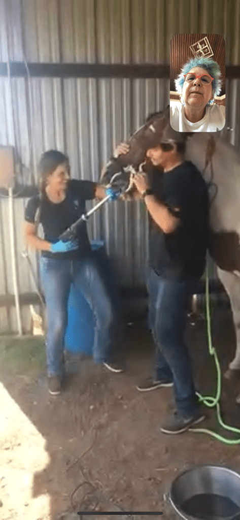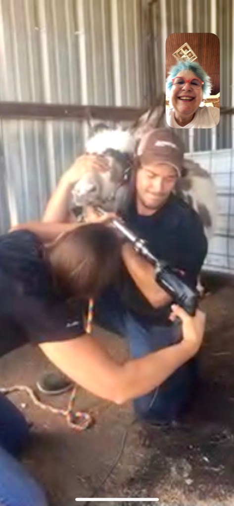 She ended up doing all of them, even poor Fiona. Of course, they said what a great donkey she is, etc. I felt sorry for her with the giant mouth-opening appliance in her. The good news is that they do sedate the animals for this undignified procedure.
