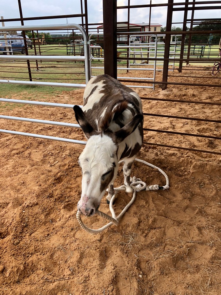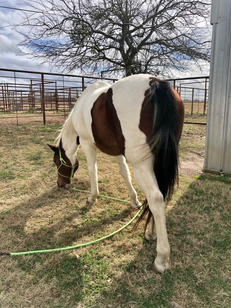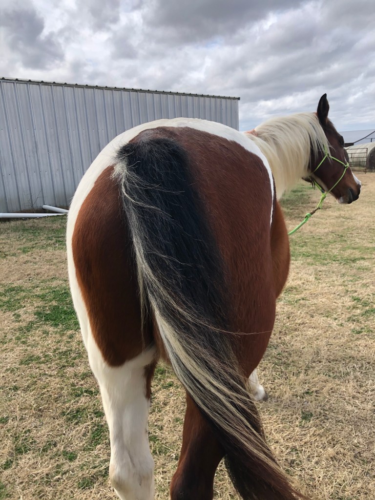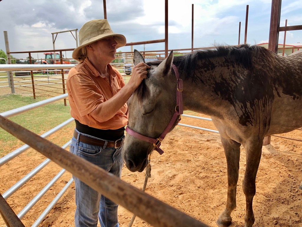 Through all the prodding, tail pulling, and leg stretching, Apache was a true gentleman gelding, albeit a happy one. In fact, when a leg stretch didn’t quite work, he cooperatively picked his foot up and angled it over to Trixie as if to say, “Try again, I’ll do better this time.” At a certain point, Trixie and I just stood there grinning at how great he was doing. She said that this is why she does what she does, seeing an animal with an improved quality of life like Apache has.