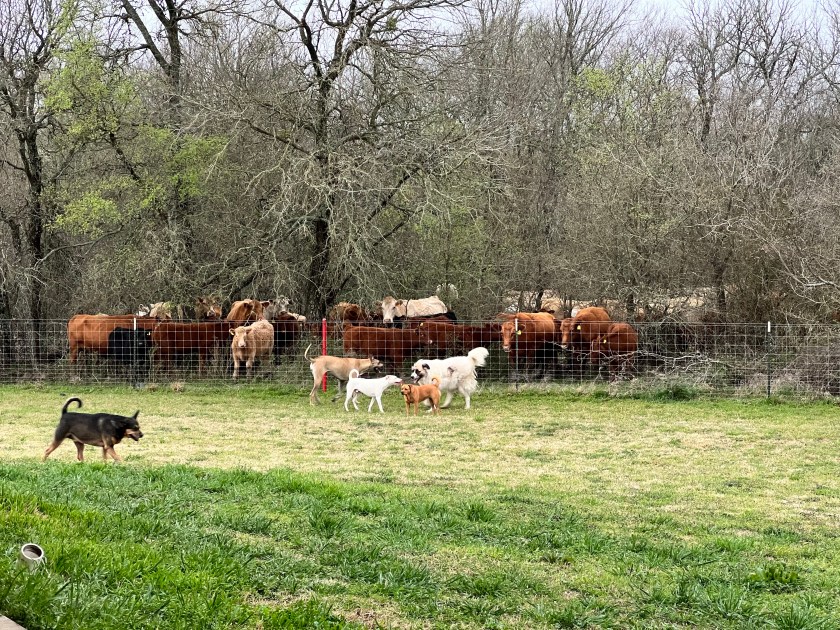 As I shared yesterday, I’d battened down the hatches outdoors, so by the time the weather got bad, I was cooking dinner and watching the three or four straight hours of weather coverage on the television. I know someone in nearly every place that tornadoes were threatening, so that was nerve wracking. Even the cows were unhappy. They all crowded into the woods, mooing and bawling, which is what I guess they do when they feel a storm coming. The dogs liked THAT.