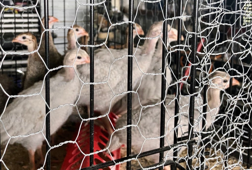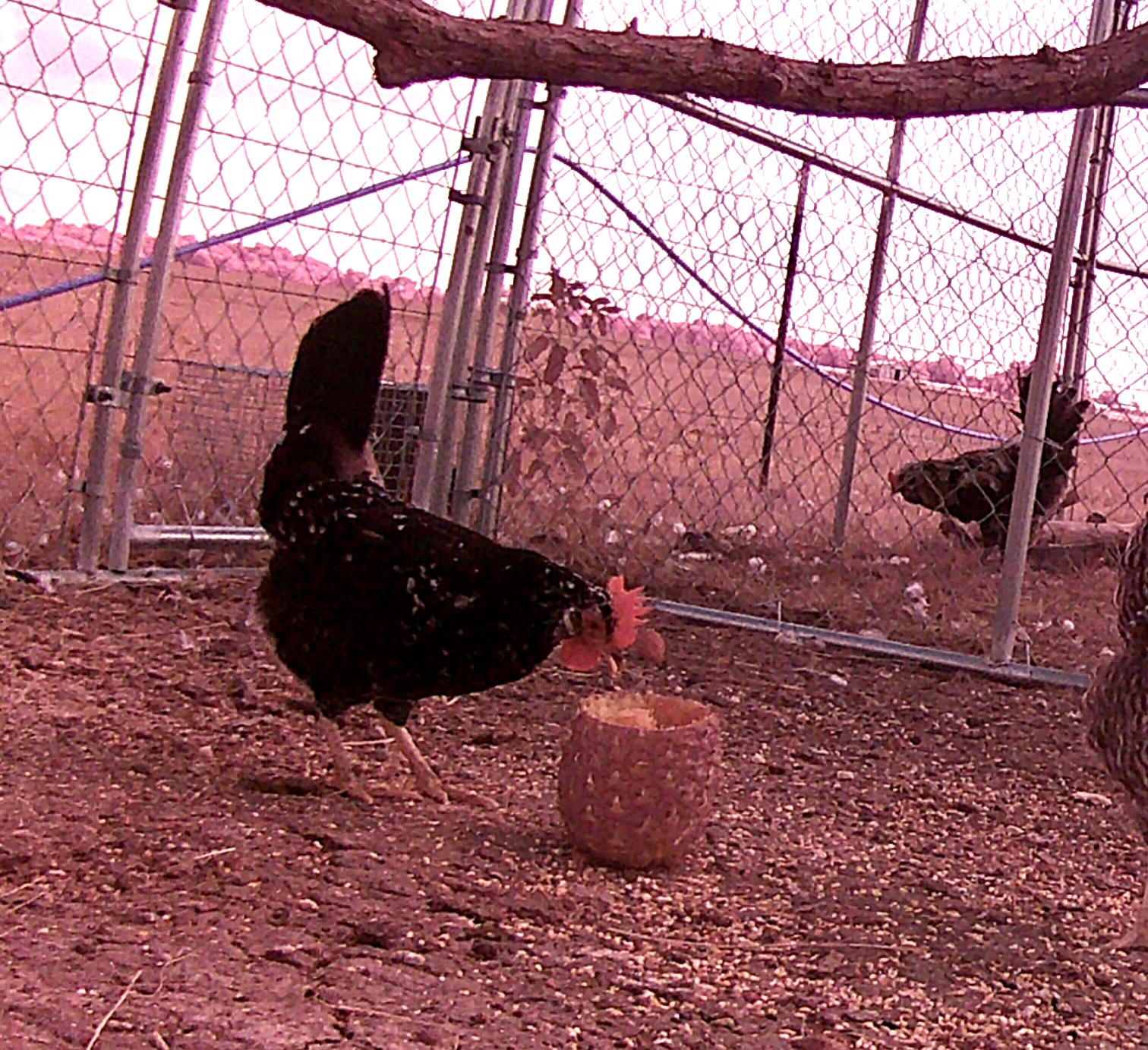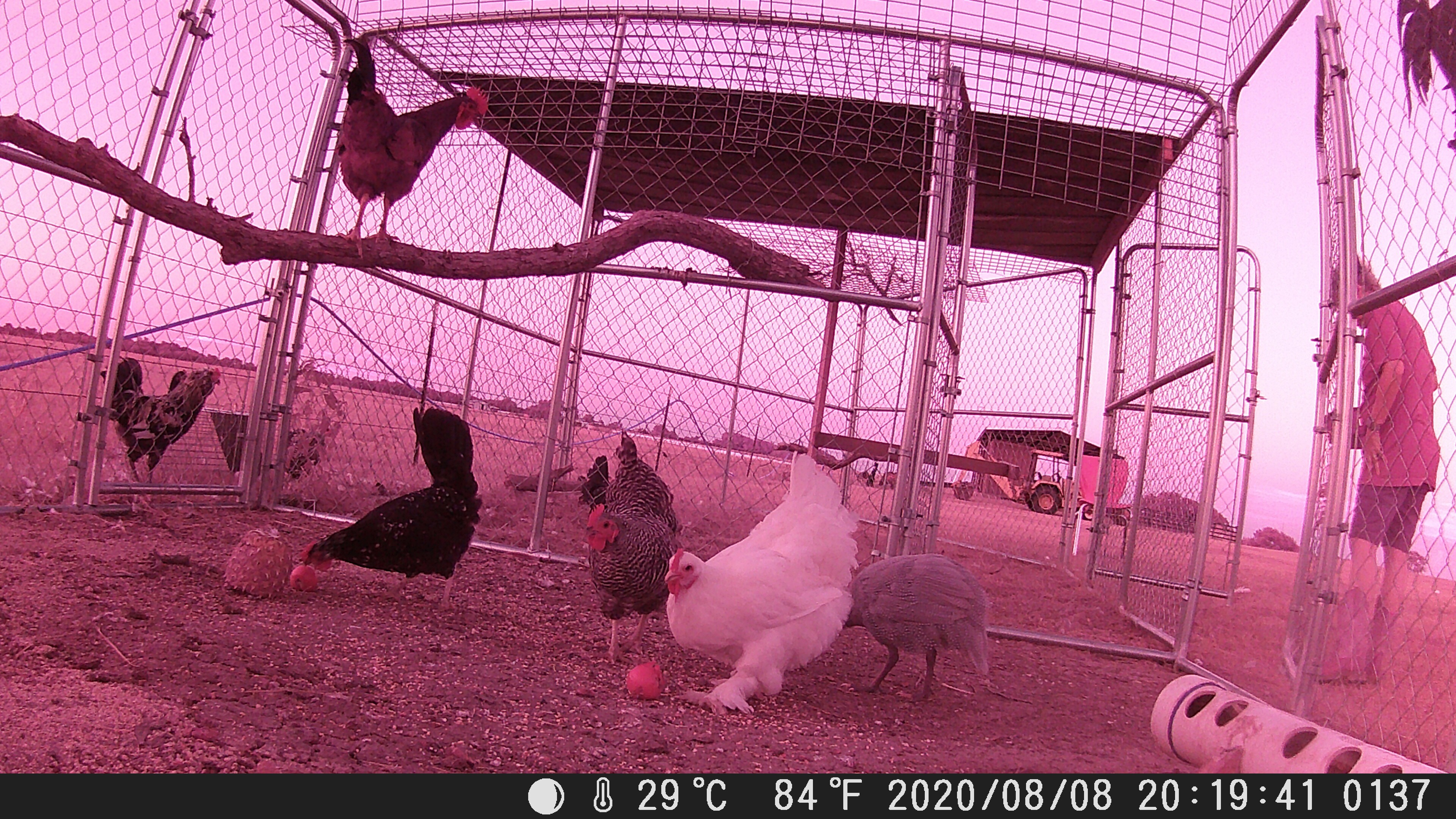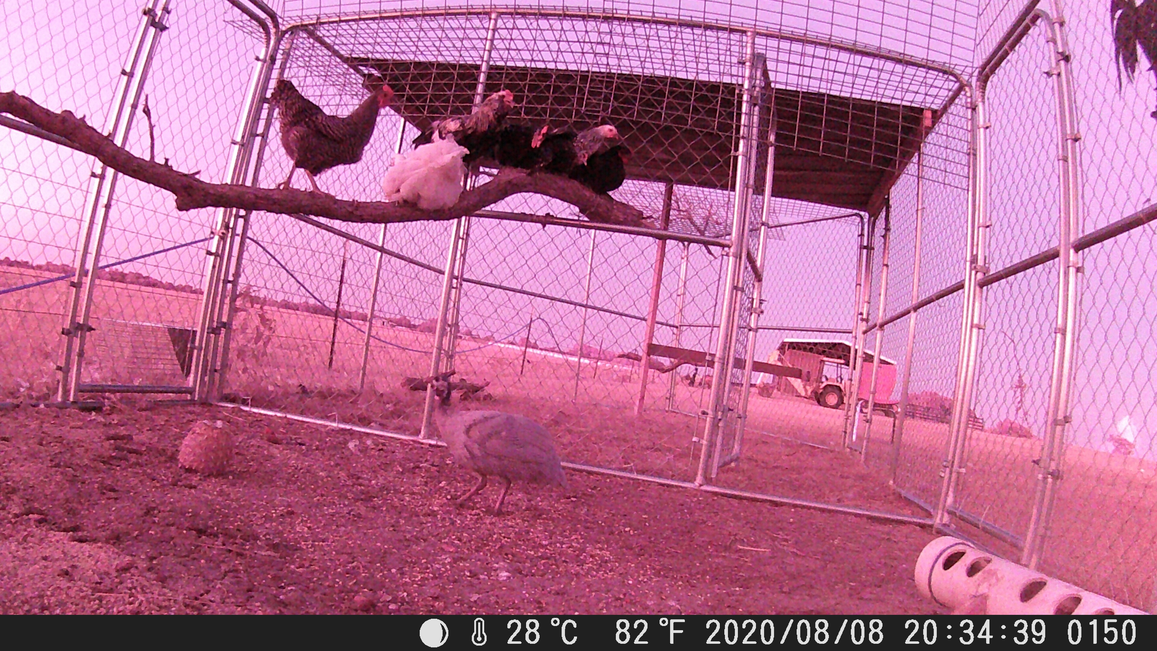 Two guineas and poor Henley, trying to roost. Gracie is trying to find that delicious tuna she smells in the raccoon trap.