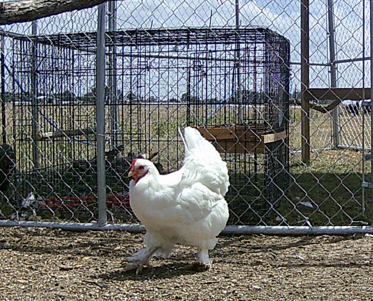 The panicked flock is now well inside the chicken run, where Bruce is guarding them, along with his gals. They are happy to have grass and bugs to enjoy, and they can bond with the chickens.