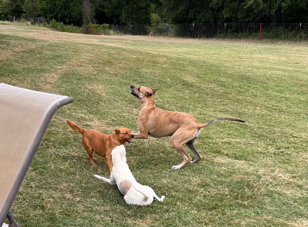2. Watching the dogs play. Penney and Carlton run and run while Goldie waits to tackle them.