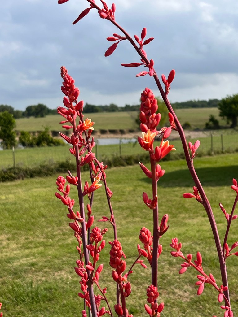 The routine they came up with is to sedate all the dogs, take care of the horses, then do the dogs. It went pretty well. I even had time to photograph the cool flower stalk on the palmetto bush.