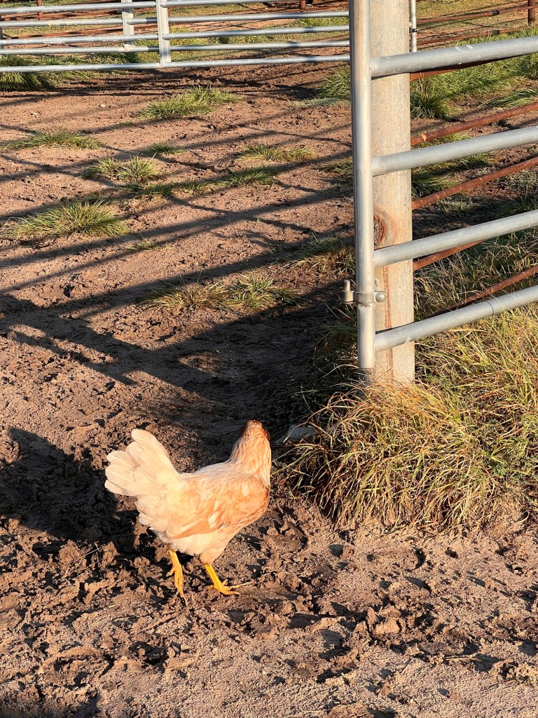 Today I fed the hens late, since I was out with Goldie all morning. I noticed that Bianca was in the jungle half of the run, where it’s shady. She realized I’d filled the water trough for the other hens and ran out to stand next to the door. She wanted some. I seized the moment while the black hens were keeping as far from me as possible and opened the door. It only took a little chicken wrangling to get Bianca to go in there and start pecking away at the food. Soon they were all eating together. Yay.