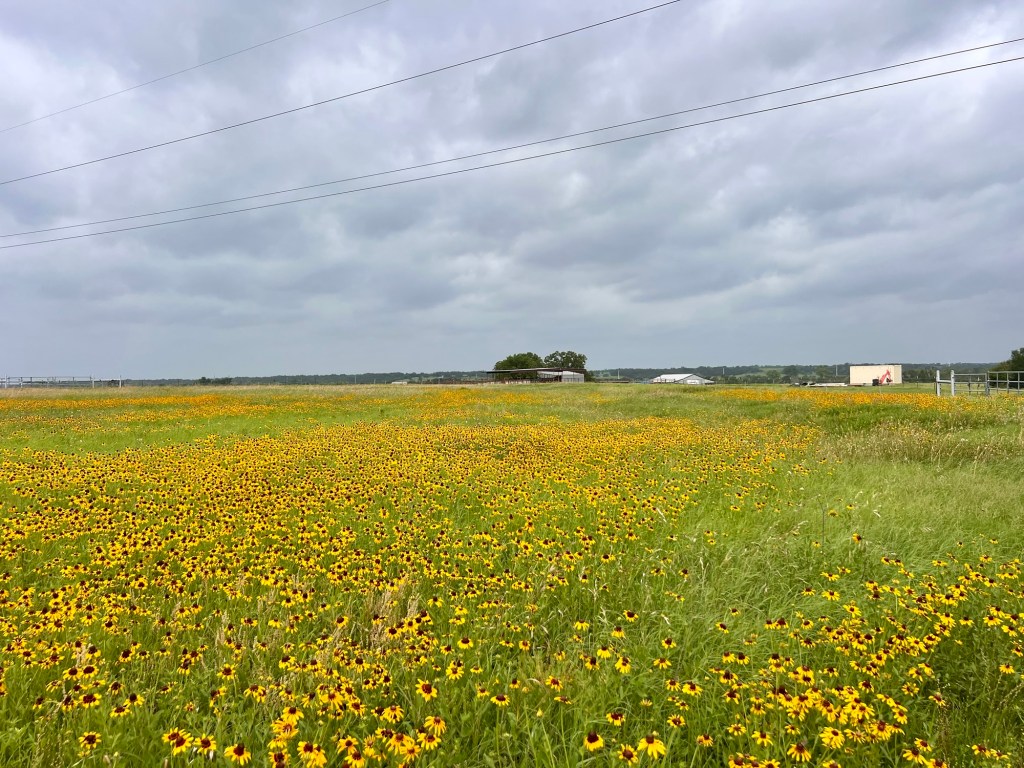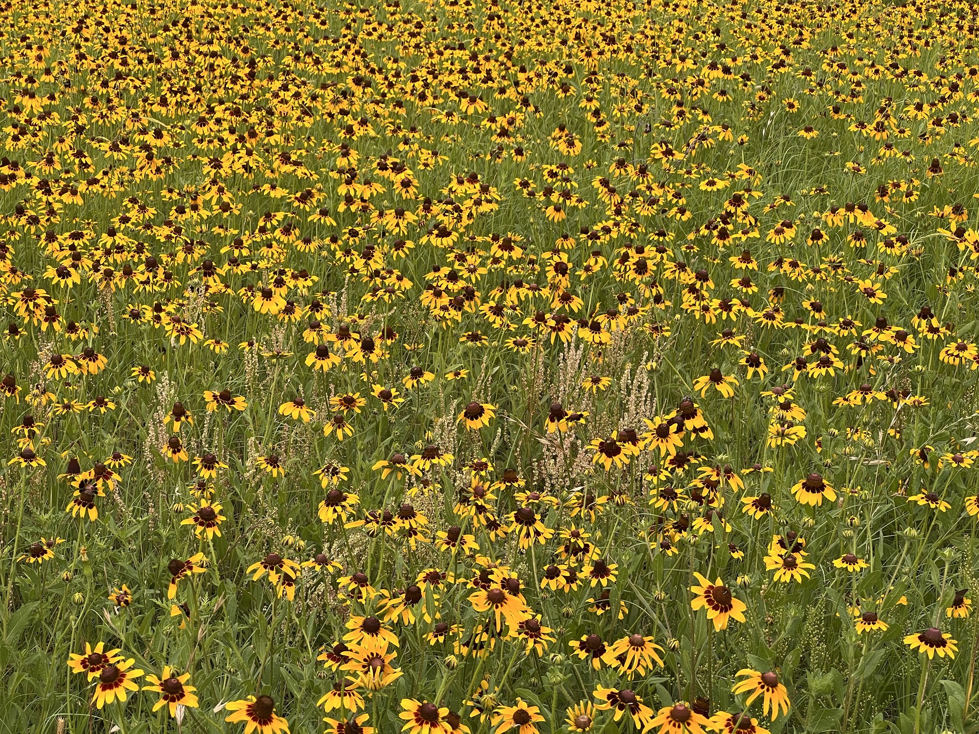 Eventually I turned and walked down the road connecting our two ranches and leading by my son’s cabin residence. Wow. There were some beautiful vistas of black-eyed Susans in the fancy pasture.