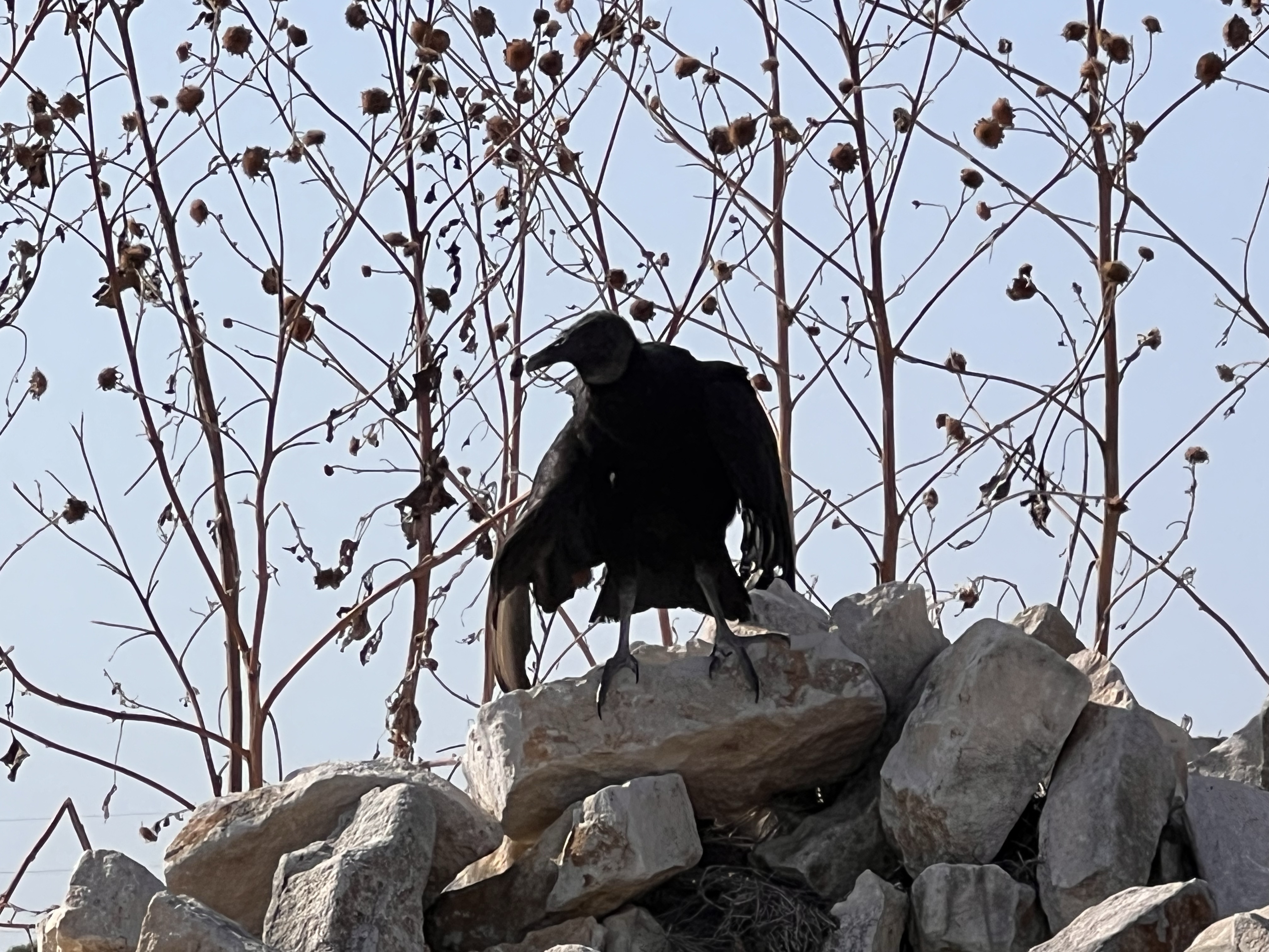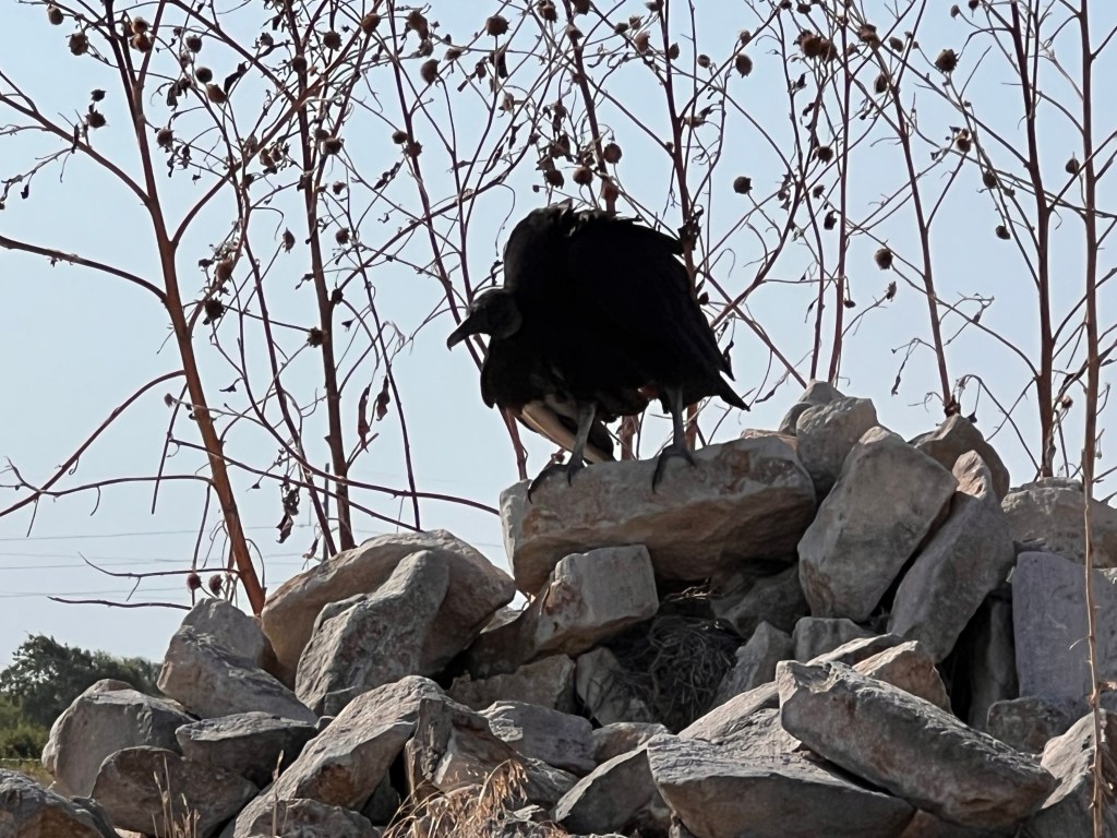 This morning when I went out, the black vulture was still on top of the rock pile. It looked like some of the water that had been left after Drew messed with it was gone. Good sign.
