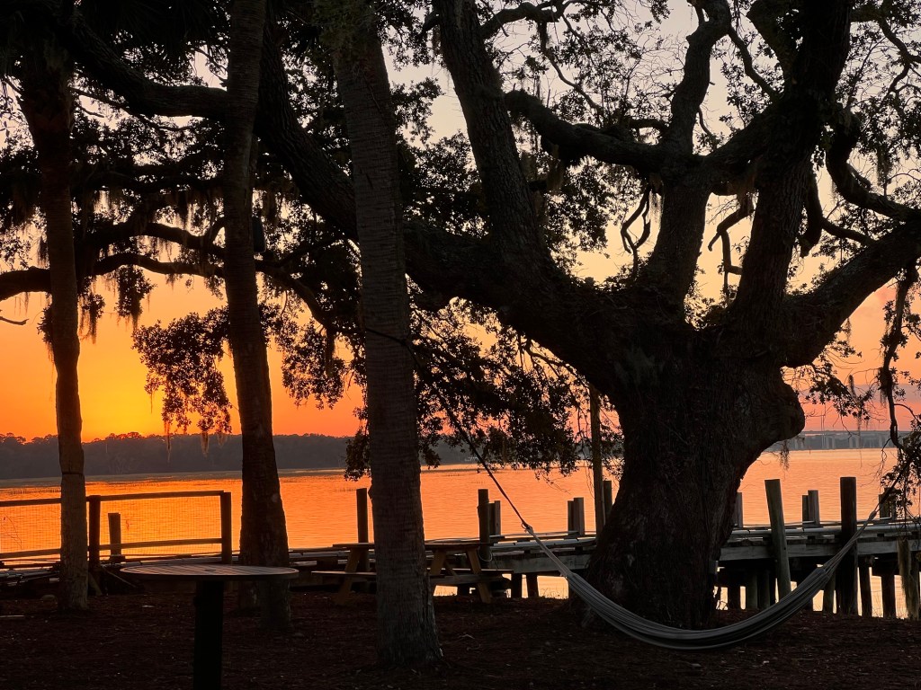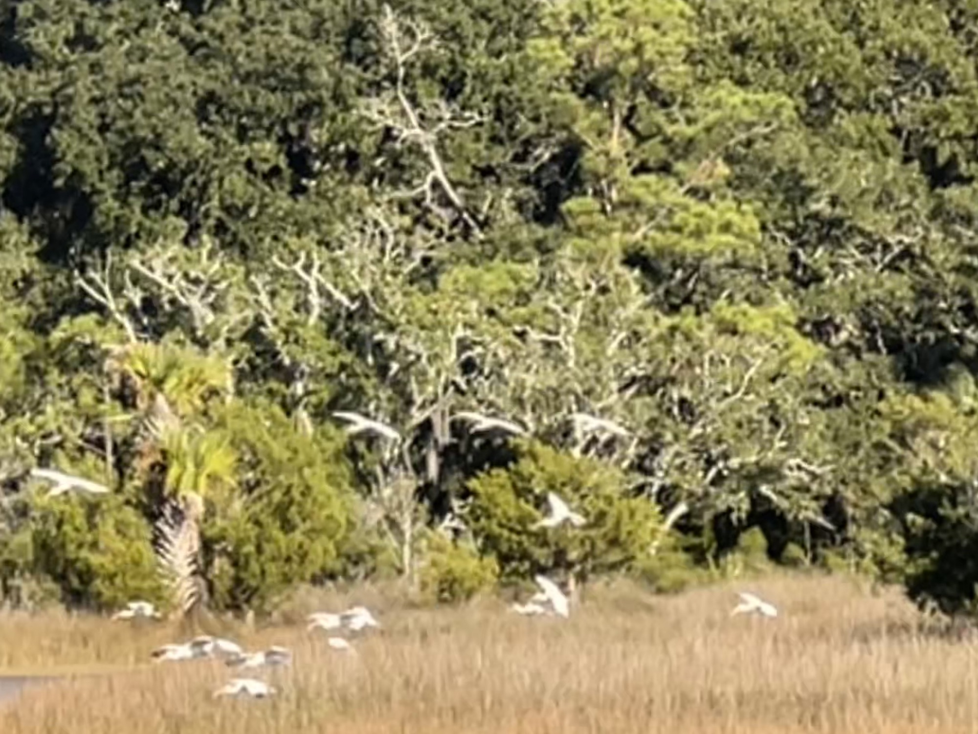 We had dinner in Murrell’s Inlet, where all the restaurants are. It was fine, and I enjoyed the marsh view, but there weren’t many birds. One tree did gradually fill up with pelicans. A new one glided in every five minutes or so. I guess that tree is a favorite roost.
