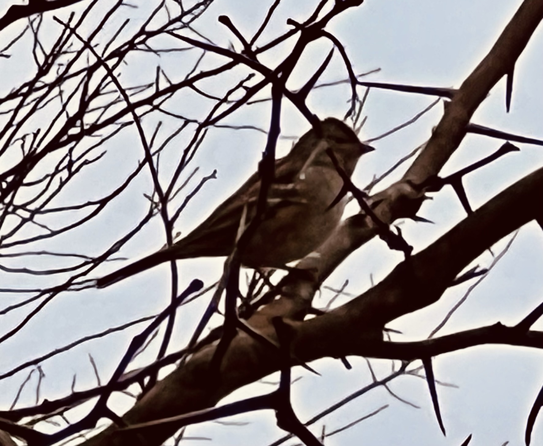 Nicely framed sparrowMockingbird in a treeMale and female LichenThe prickly pear with really long pricklesTwo more dovesVultures drying offMockingbird (this and the rest are phone photos)Mistletoe The next three are various views of a poorly lit female or immature White-crowned Sparrow.