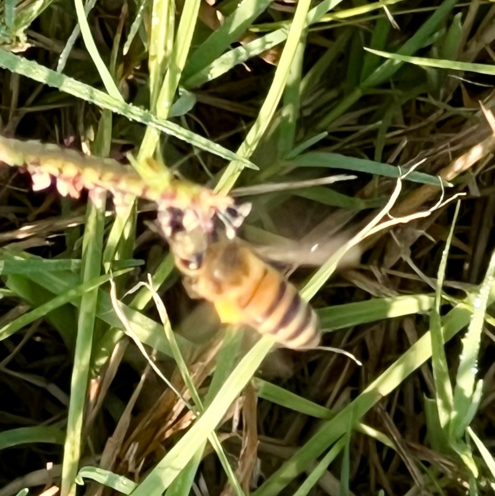 First, bees. For the past week or two I’d been noticing a lot of honeybees around my legs. It seemed like the earth was buzzing. Upon closer examination, I saw dozens of bees crawling on the tiny blossoms of the grass (I think it’s Dallis grass) that is blooming now. The bees were all very busy, zipping from flower to flower (not leisurely sipping as they usually do), and they were loaded with pollen.
