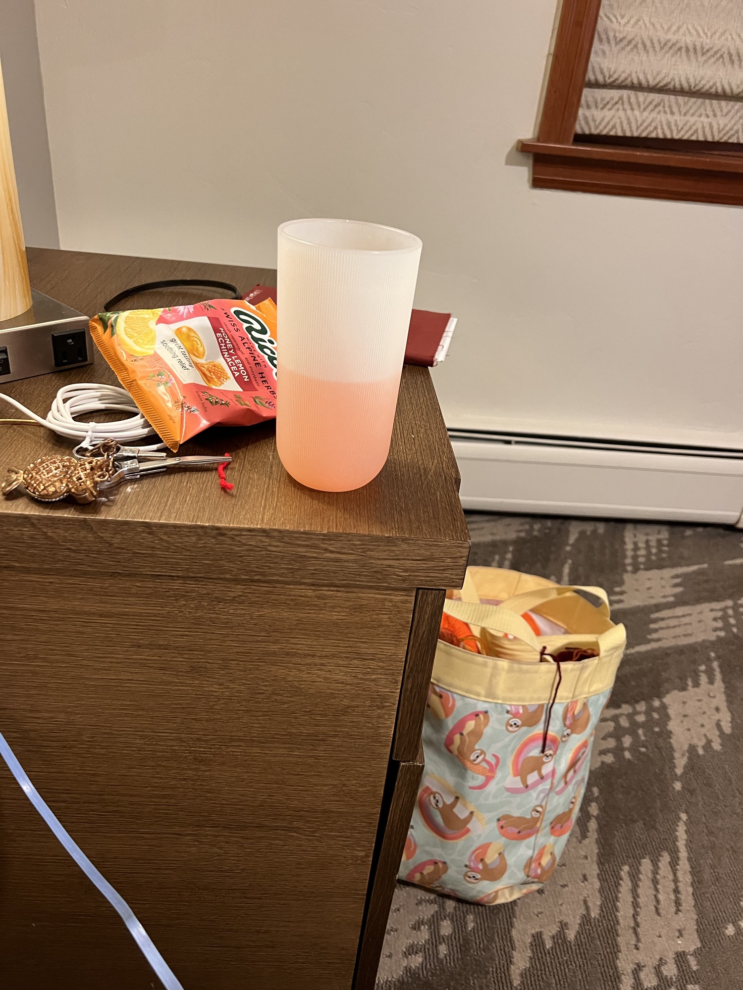 Hello from the Sick Ward known as my condo bedroom. It features knitting, reading material and used socks. I also have flavored water, cough drops, and chargers for my vital electric devices. Add the television and my world is complete.