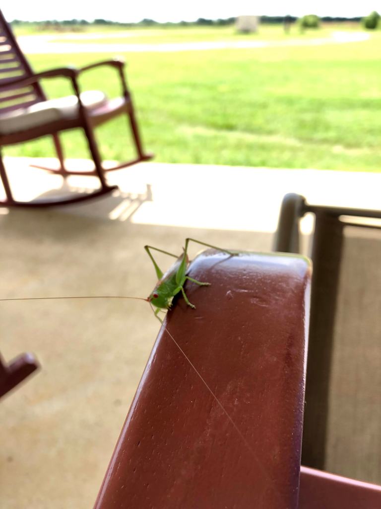 The dogs wanted to go out this morning, so I went out on the porch to drink some coffee and watch them play. I quickly realized that in fact, I was being watched, as well. There was a curious katydid sitting on my chair, waving her antennae at me. Mike Yager, you can stop reading now. Thank you for clicking. (He’s not a fan of these things)