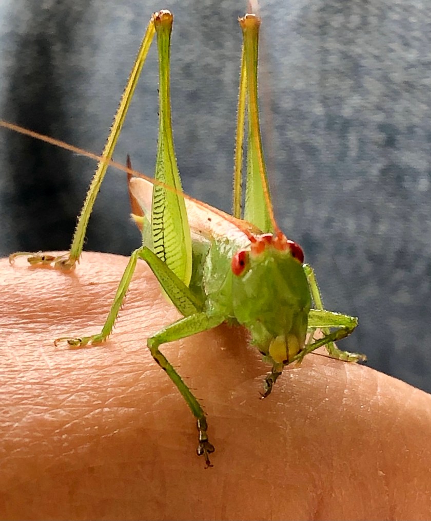 My whole life I’ve heard about katydids but, I guess I’d never seen one in person until yesterday. I was driving into the parking lot at work, when I saw a bright green leaf, but the leaf turned out to be an insect.