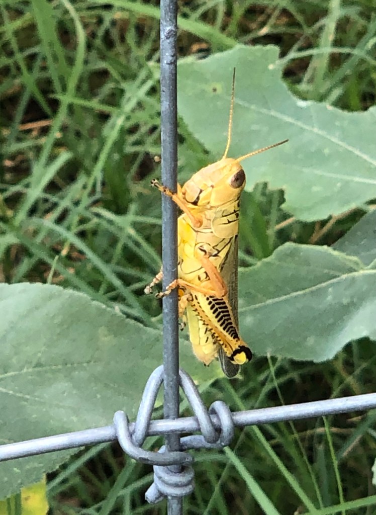 What I’d intended to write about today was grasshoppers, though. Every few years, we get a bumper crop. While I know both my children are creeped out by them, I am glad for the chickens’ sake, since they do love to chow down on grasshoppers. The vast majority this year are differential grasshoppers (Melanoplus differentialis), which are the kind known for messing with crops. (I saw one other type today, an obscure bird grasshopper, but I didn’t get a stellar photo.)