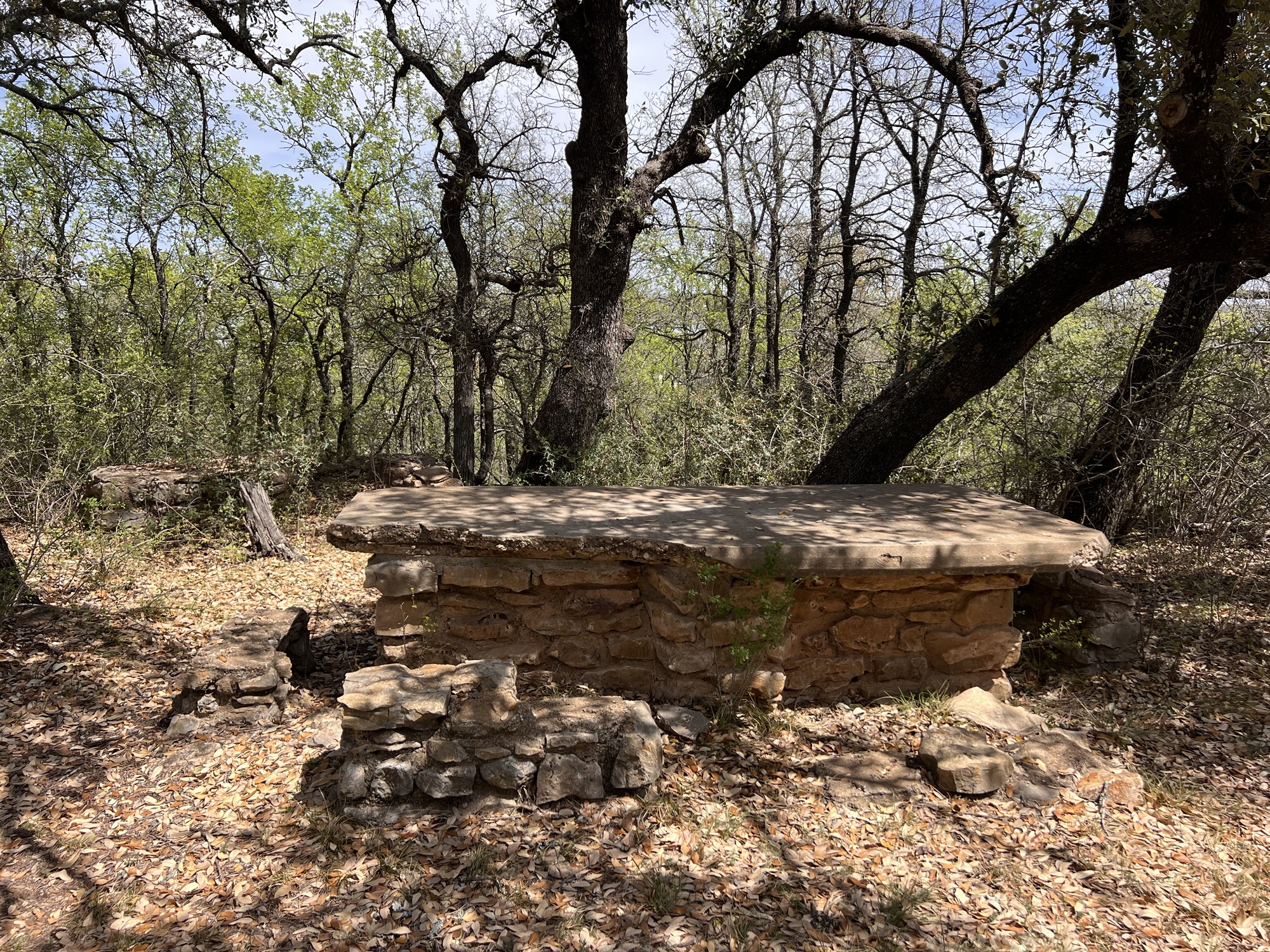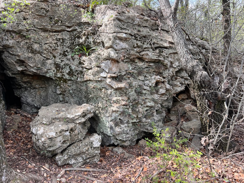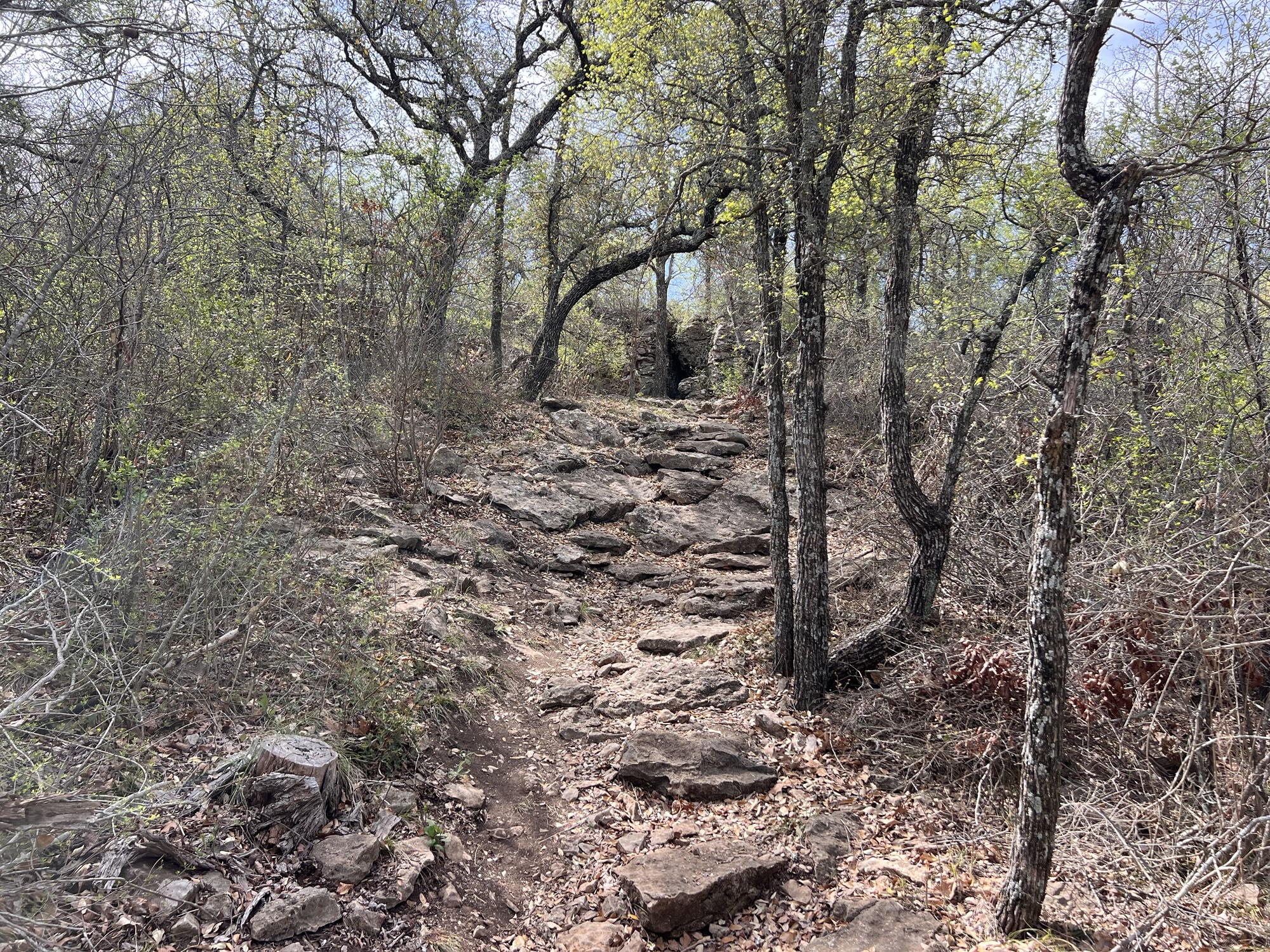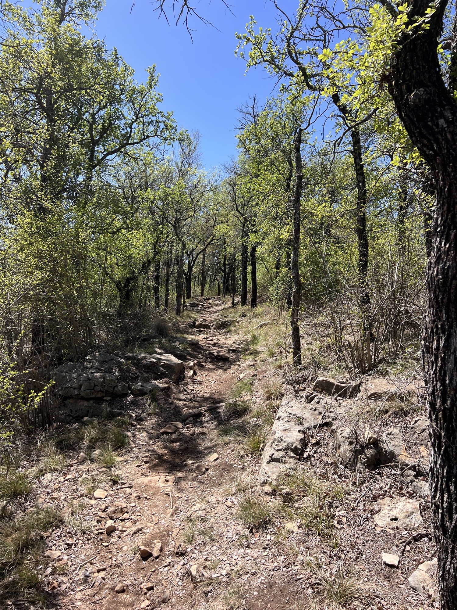 The terrain went up and down among wooded terrain with beautiful rocks that looked like stacked stone and some open areas as well. There were mostly oak and cedar elms but other trees were scattered around as well.