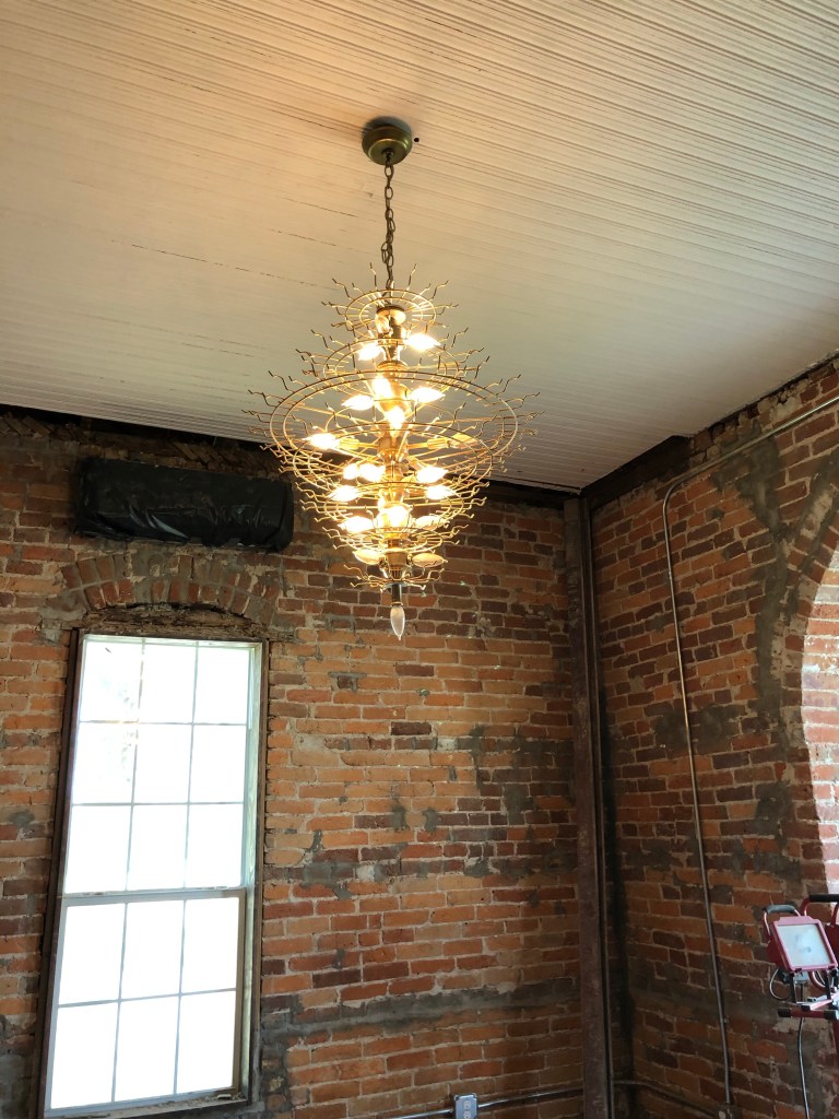 The naked chandelier has light (mostly)