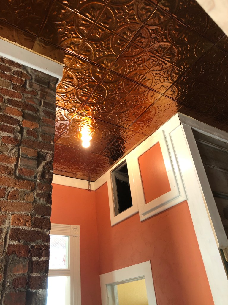 A real highlight of the Pope project is finally getting to install the tin ceiling tiles. They are pretty awe-inspiring, if you ask me, and I guess I matter on this topic!